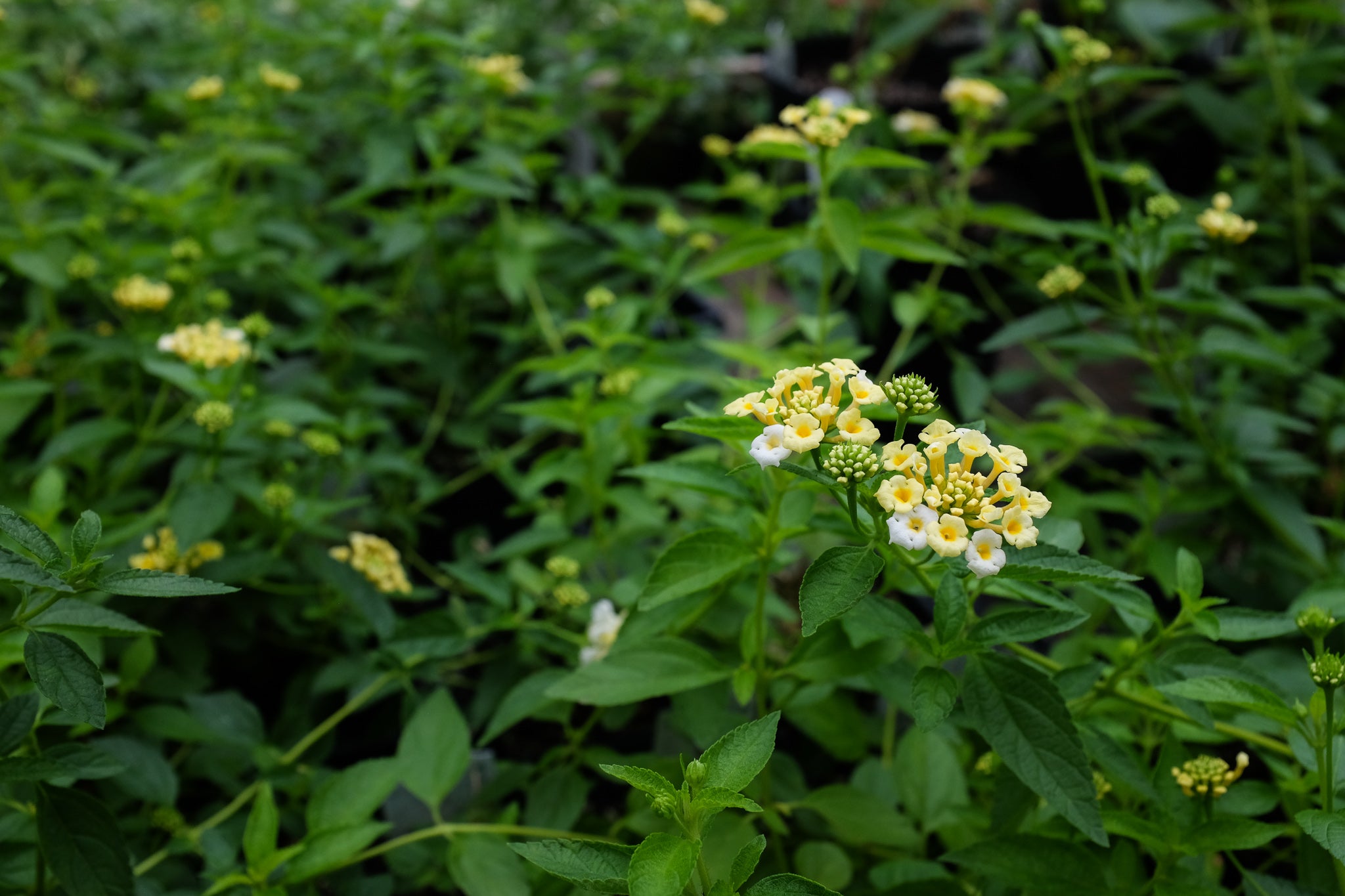 Sun. Height 18-24 in. Width 22-30 in. Low growing, mounding lantana that produces an abundance of soft yellow flowers that mature to white and are borne from spring to fall attracting a variety of other smaller pollinators as well as butterflies. Very vigorous, an excellent low maintenance groundcover or filler in containers.