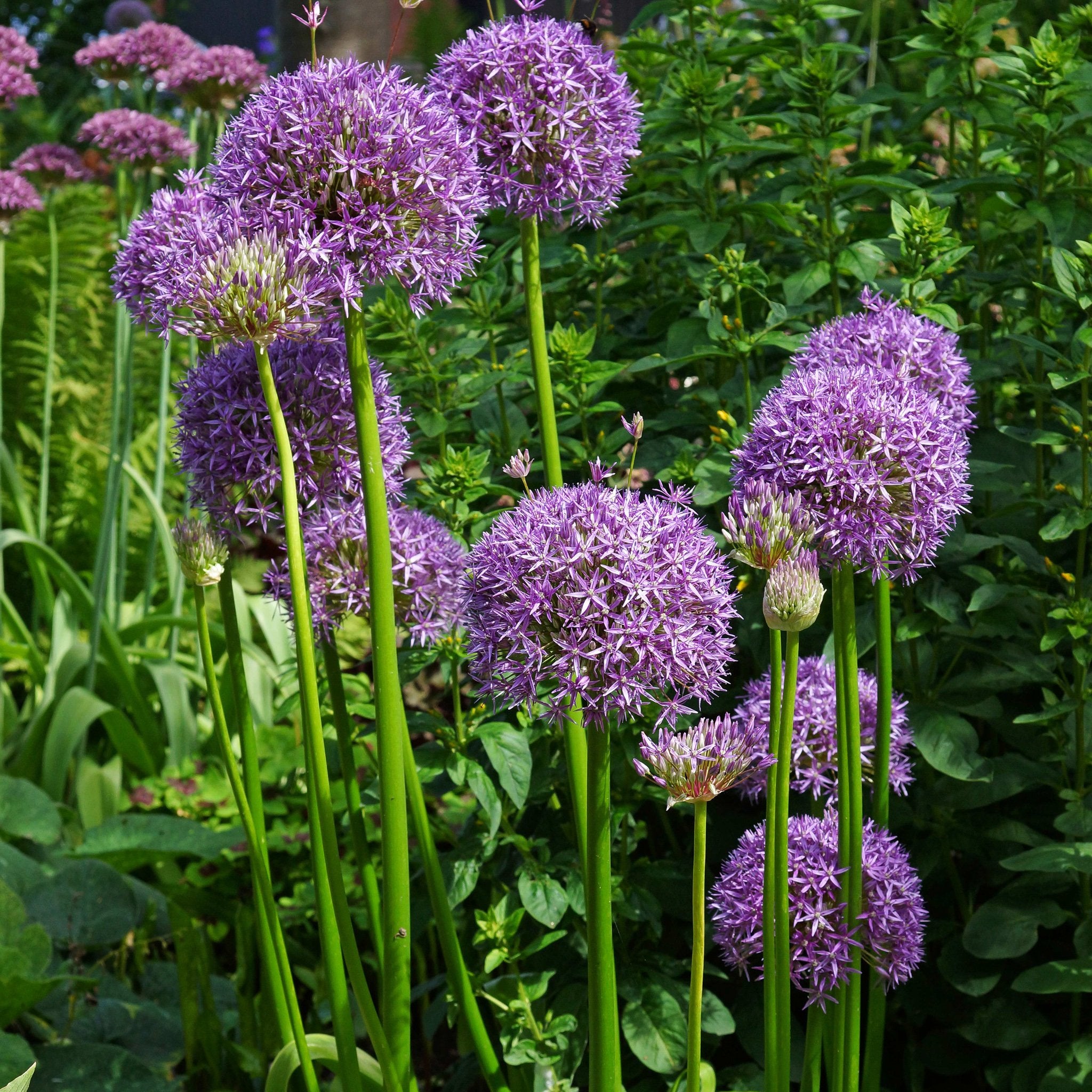 Allium 'Gladiator' is a vibrant ornamental onion that features large spherical clusters of lavender-purple atop tall, sturdy stems that reach up to 48 inches tall. Bulbs should be planted at a soil depth of 4 inches and spaced 8 inches apart. Ideal planting season spans from September to December; blooms expected in May to June.