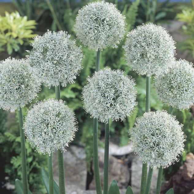 Allium 'Mount Everest' is a striking ornamental onion that features large spherical clusters of pure white blooms atop tall, sturdy stems that reach 36-44 inches tall. Bulbs should be planted at a soil depth of 4 inches and spaced 8 inches apart. Ideal planting season spans from September to December; blooms expected in May to June.