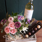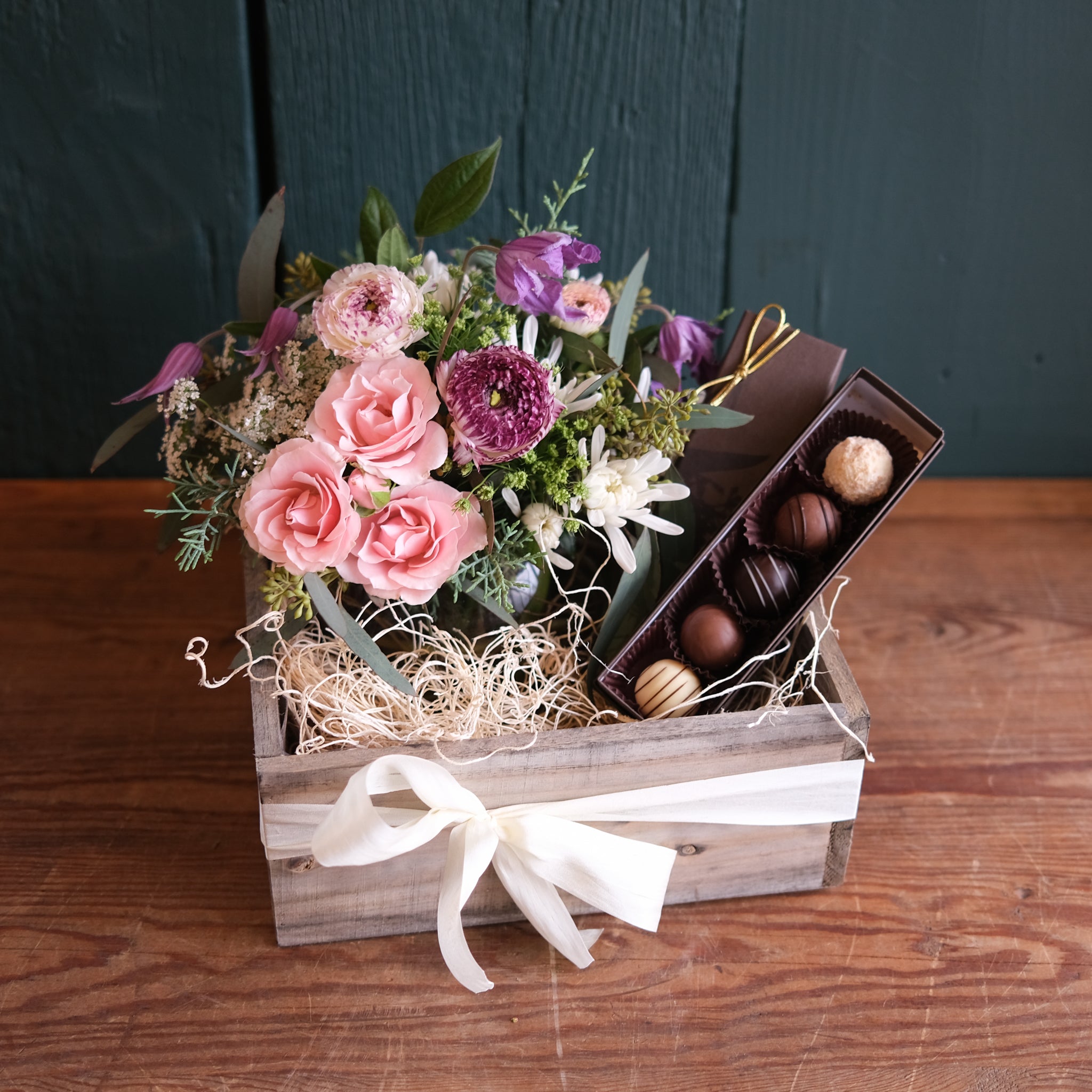 A classic gift box of flowers and chocolates, featuring a low and lush arrangement nestled in a wooden crate with two boxes of chocolate truffles. For an extra indulgent treat, add a bottle of wine.