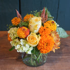 A low and lush design featuring yellow and orange autumn blooms.