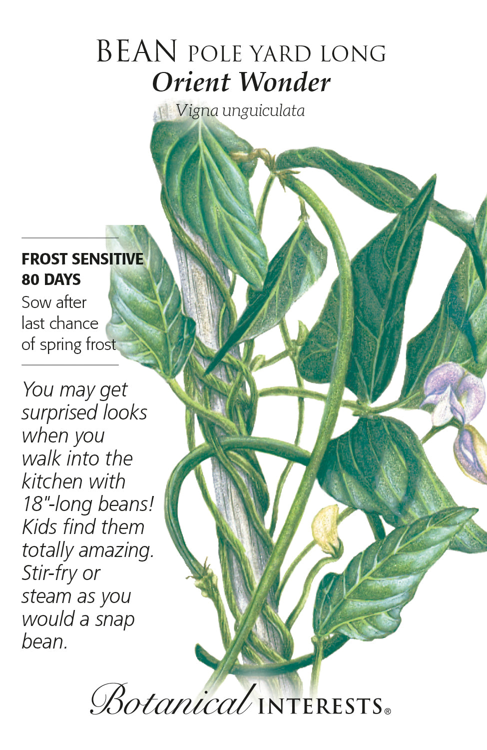 Also called Chinese long beans or asparagus beans, 'Orient Wonder' is a delicious and beautiful, dark green, pole bean. Seeds are slow to develop, so pods stay smooth and slender. 'Orient Wonder' is much more tolerant of weather fluctuations (cool, dry to hot, humid) than traditional green beans. It's easy to grow, prolific, and almost indestructible. Beans are most tender at 12"–18" long, even though they can grow as long as 30".