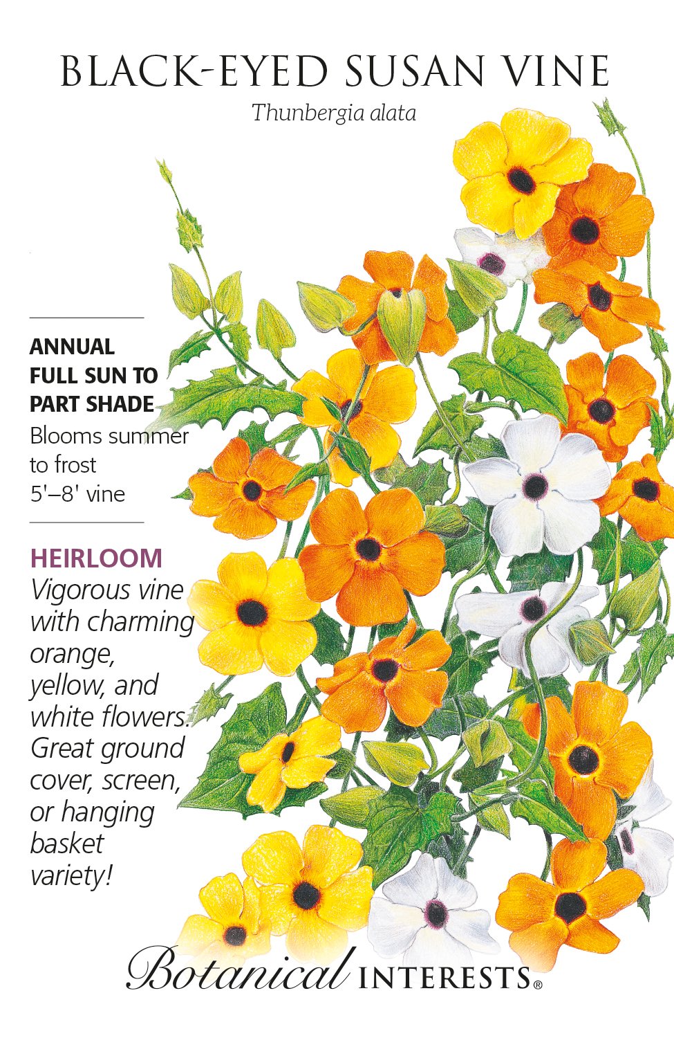 Inspiring poets with its beauty, this 1800s heirloom can be enjoyed in window boxes, hanging baskets, as a ground cover, as a screen, on a trellis or fence, and decorating mailboxes and columns. You will be rewarded with lush foliage and masses of blooms all summer long in vibrant orange, yellow, and white; the colorful petals make a striking contrast to the black "eye".