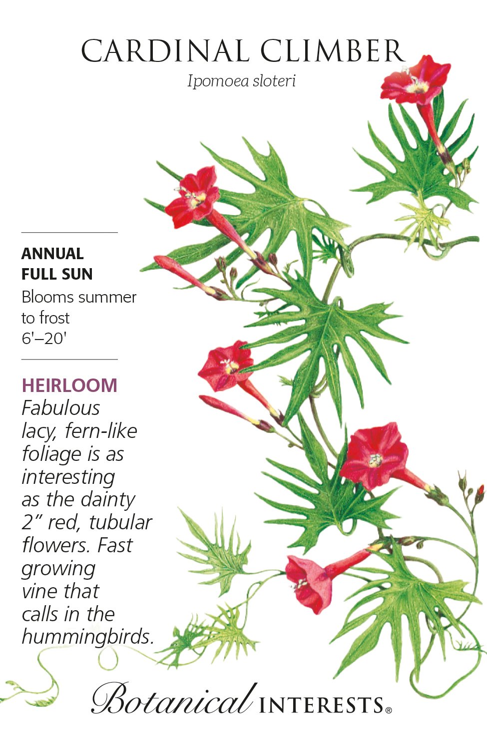 Need a vine for a trellis, pole, or fence? Cardinal climber makes a nice partner with scarlet runner bean or morning glory. Deep red flowers with a white/yellow throat attract pollinators and hummingbirds like crazy! We can't say enough about the beautiful, fern-like foliage that together with the flowers make this an eye-catcher! Great container variety. Caution: Most parts of this plant are poisonous if ingested.