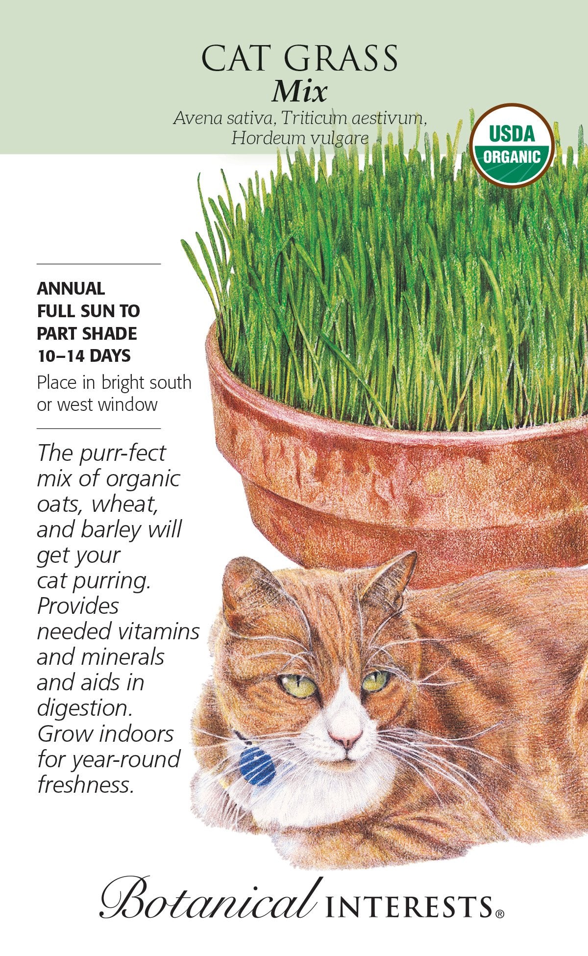 Even cats need their greens! This organic barley, oats, and wheat blend is rich in antioxidants, vitamins, minerals, and amino acids. Not only does cat grass help in digestion by moving the hairballs along, but it gives them a shiny coat and freshens breath! Because it's grown indoors, cat grass can be served year-round at its peak of freshness. Grass is ready to eat in as little as 2 weeks! Safe for dogs, too!
