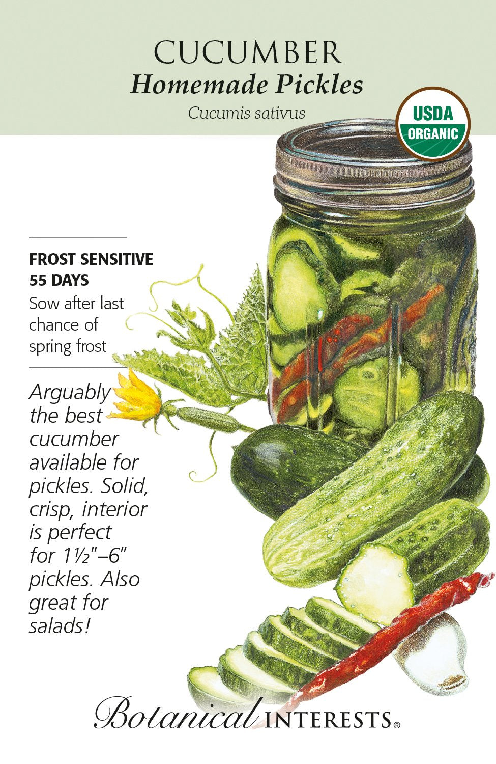 Making pickles at home is easy with 'Homemade Pickles'. This plant has very high yields, and is ready to harvest early; pick anywhere from 1/2"–6" long. They have the perfect interior texture for pickles, but can also be eaten fresh. The 4'–5' compact vines are great in containers. Disease resistant.