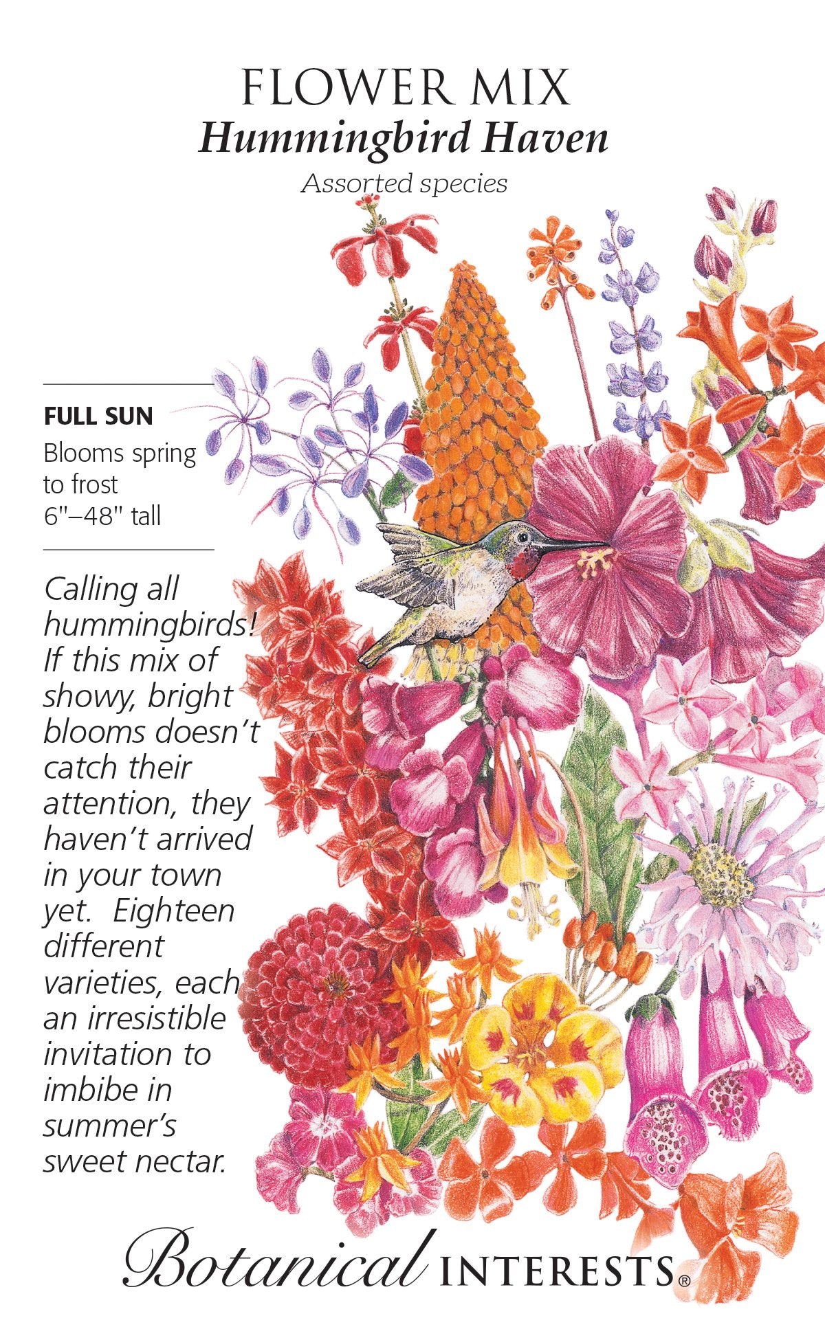 Your garden haven for hummingbirds will not only attract and provide nectar for the tiny, bright creatures, but also present you with a glorious array of vivid floral colors that will last spring to fall for your enjoyment as well. Attracts other pollinators, too! Shake packet gently before opening to ensure even mixture of seeds.