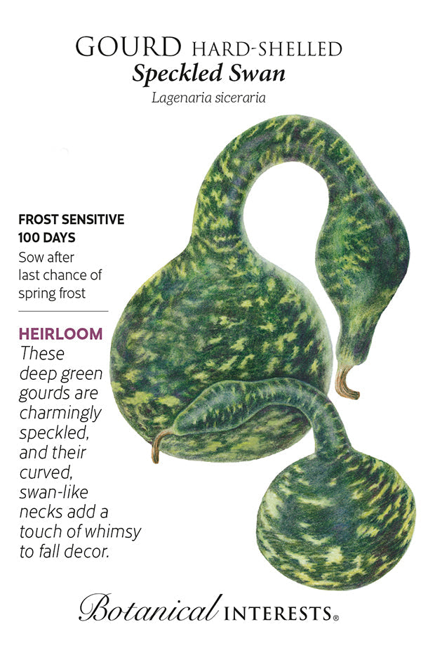 A vibrant, emerald green dotted with light green speckles, 'Speckled Swan' makes a naturally beautiful addition to an autumnal display. Hard-shelled gourds, like 'Speckled Swan', can also be cured and last indefinitely—perfect for craft projects to let your imagination run wild! Carve, cut, drill, or paint them like you would do with wood for a variety of creative endeavors. See inside of packet for curing instructions. 'Speckled Swan' will usually have a curved neck, but a few may be straight.