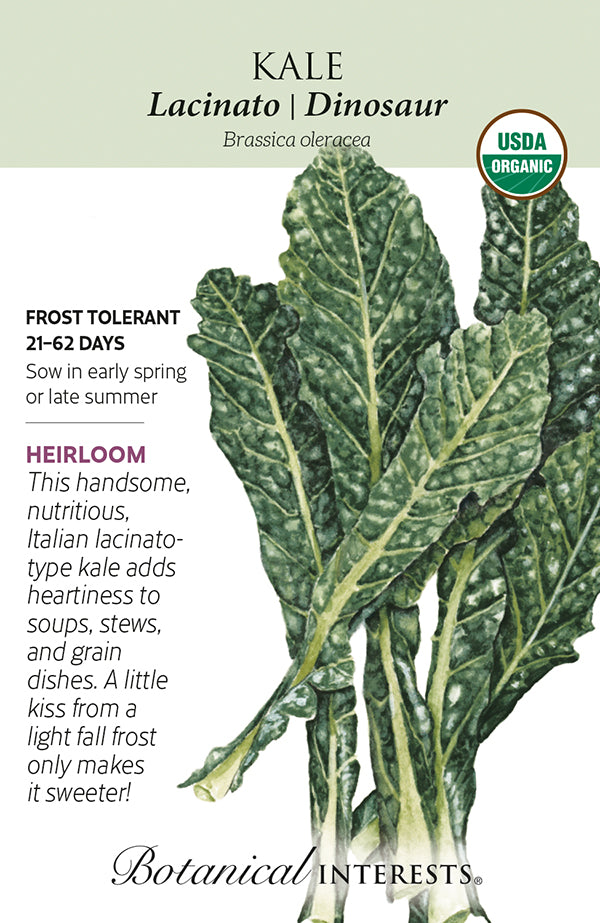 This tender kale is also known as black Tuscan kale, black cabbage, and black palm. Vigorous dark green to black leaves of this 18th century heirloom are favored by gourmets. Harvest the first shoots as tender young salad greens in just 21 days when 2"–4" tall, or achieve full-sized plants in 2 months. Try Kale & Pasta and Tuscan Kale Pesto recipes inside this packet.