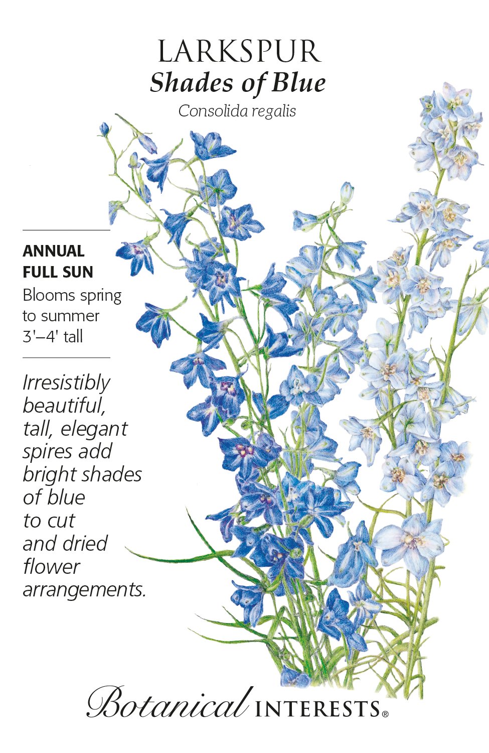 Tall flowers make an excellent backdrop to garden beds and bouquets! Grow in masses for a compelling display of light and dark blue blossoms. Reseeds readily. Larkspur blooms in the cooler weather of late spring and early summer, and in mild summer climates can continue through fall. Do not ingest, all plant parts contain toxins.