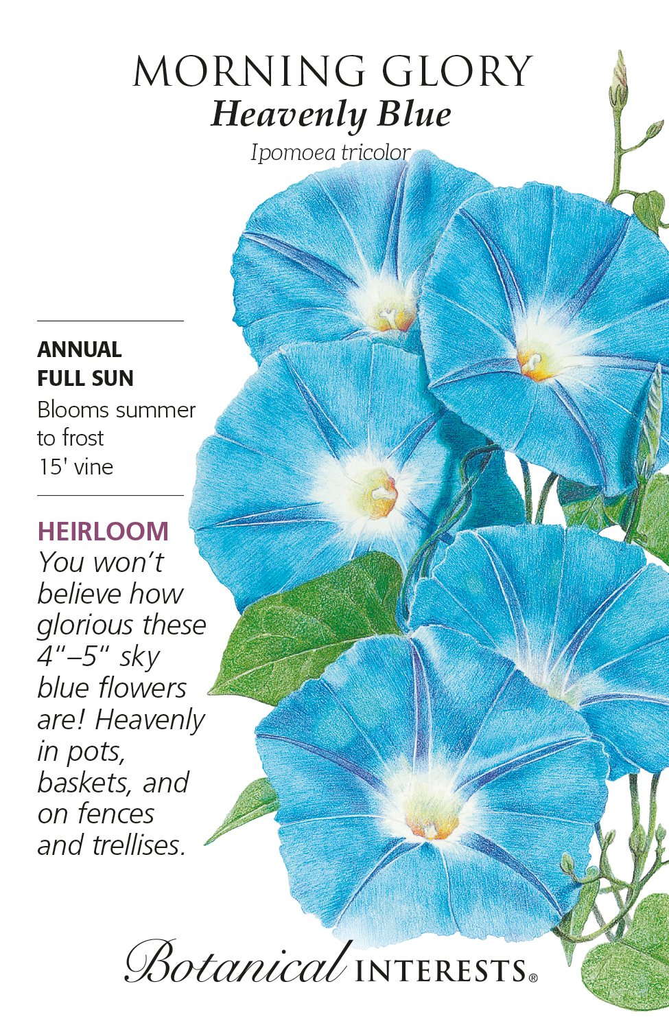 This showy climber will dazzle all who are lucky enough to behold it! Morning glory is so named because the flowers open in the cool of morning, then close when it gets too hot. On cloudy days and in the fall, the blossoms stay open all day. Caution: Most parts of this plant are poisonous if ingested.