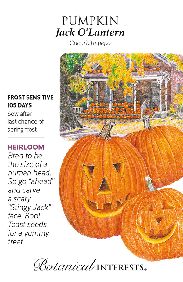 A superb pumpkin for carving since 1956! 10" tall, 10" diameter, 10–18 pounds, and stores for months. See inside of packet for scrumptious, pumpkin seed recipe, and read about the Irish myth where the jack o'lantern got its name!