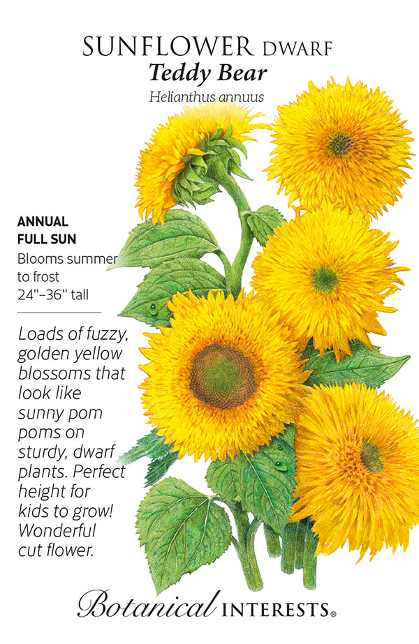 A unique addition to your flower bed, these bright yellow puffball blossoms will give you a warm, fuzzy feeling! 'Teddy Bear' produces many 3"-5" flowers on a 24"-36" tall, multi-branching plant; beautiful as a short hedge and makes a fabulous cut flower. Sunflowers are edible, with a bittersweet flavor. The petals add a pretty pop of color ion salads and desserts. The young, sunflower buds are edible, with a flavor similar to artichoke hearts. They can be grilled, marinated, or sauteed for an unusual appetizer or side dish. Great for kids to grow due to the large seed and fast growth. Drought-tolerant once established, and attracts pollinators. Non-fussy plant blooms until fall.