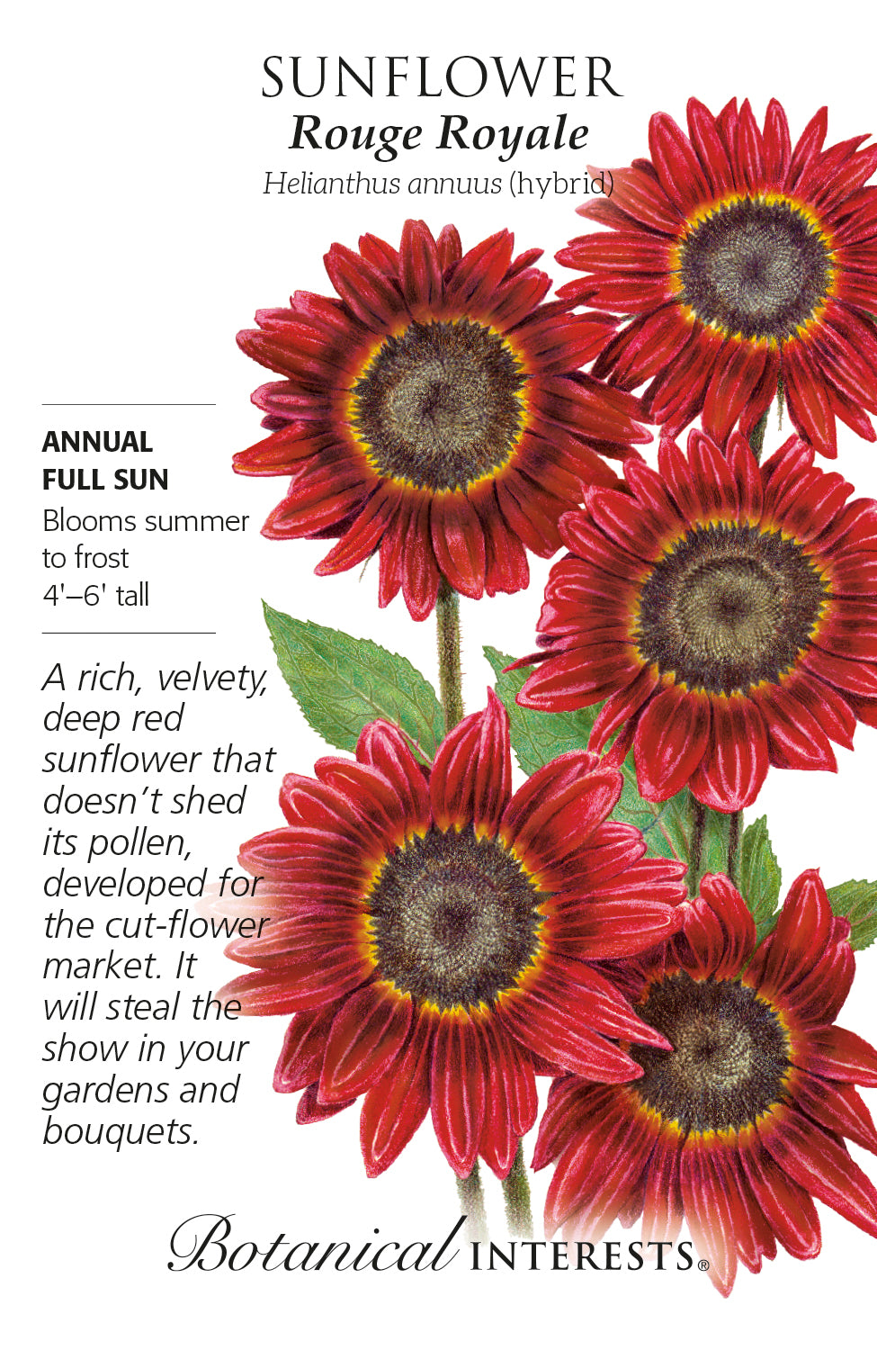 'Rouge Royale' is a stunning, true red sunflower, on multi-branching plants. A dramatic accent in beds, borders, and arrangements. For highest quality cut flowers, planting closer together will produce longer stems and smaller flowers. For long-lasting vase life, cut before flower is completely open. 'Rouge Royale' doesn't drop its pollen making it all beauty and no mess. Sunflowers are edible, with a bittersweet flavor. The petals add a pretty pop of color ion salads and desserts. The young, sunflower buds are edible, with a flavor similar to artichoke hearts. They can be grilled, marinated, or sautéed for an unusual appetizer or side dish. Drought tolerant once established.