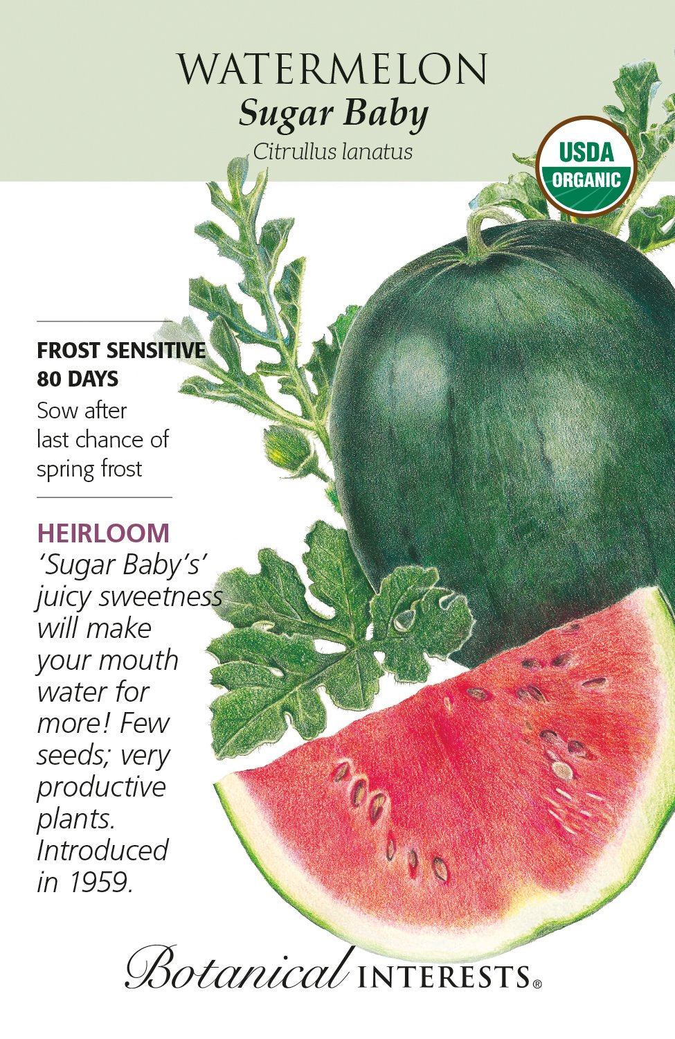 Watermelon - the word brings to mind the long, lazy days of summer, picnics, and barbeques. 'Crimson Sweet' is a high-quality old standard of home gardens, weighing about 20-25 pounds with bright crimson flesh. With just a little care, it can be easily grown in northern climates; see inside of packet for details. Bottom turns ivory when ripe. Resistant to fusarium wilt and anthracnose. This packet sows up to 17 mounds.