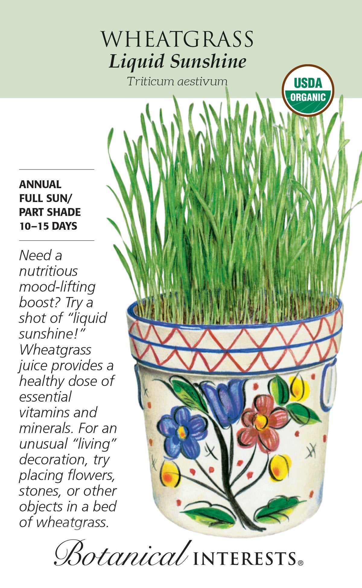 Wheatgrass contains an abundance of nutrients. The seeds, also known as hard winter wheat berries, germinate rapidly into beautiful greens that can be juiced; the juice is packed with vitamins, minerals, and chlorophyll! Be sure to save some seeds to sow for beautiful greenery in indoor containers for table centerpieces (especially to nestle eggs in at Easter!).