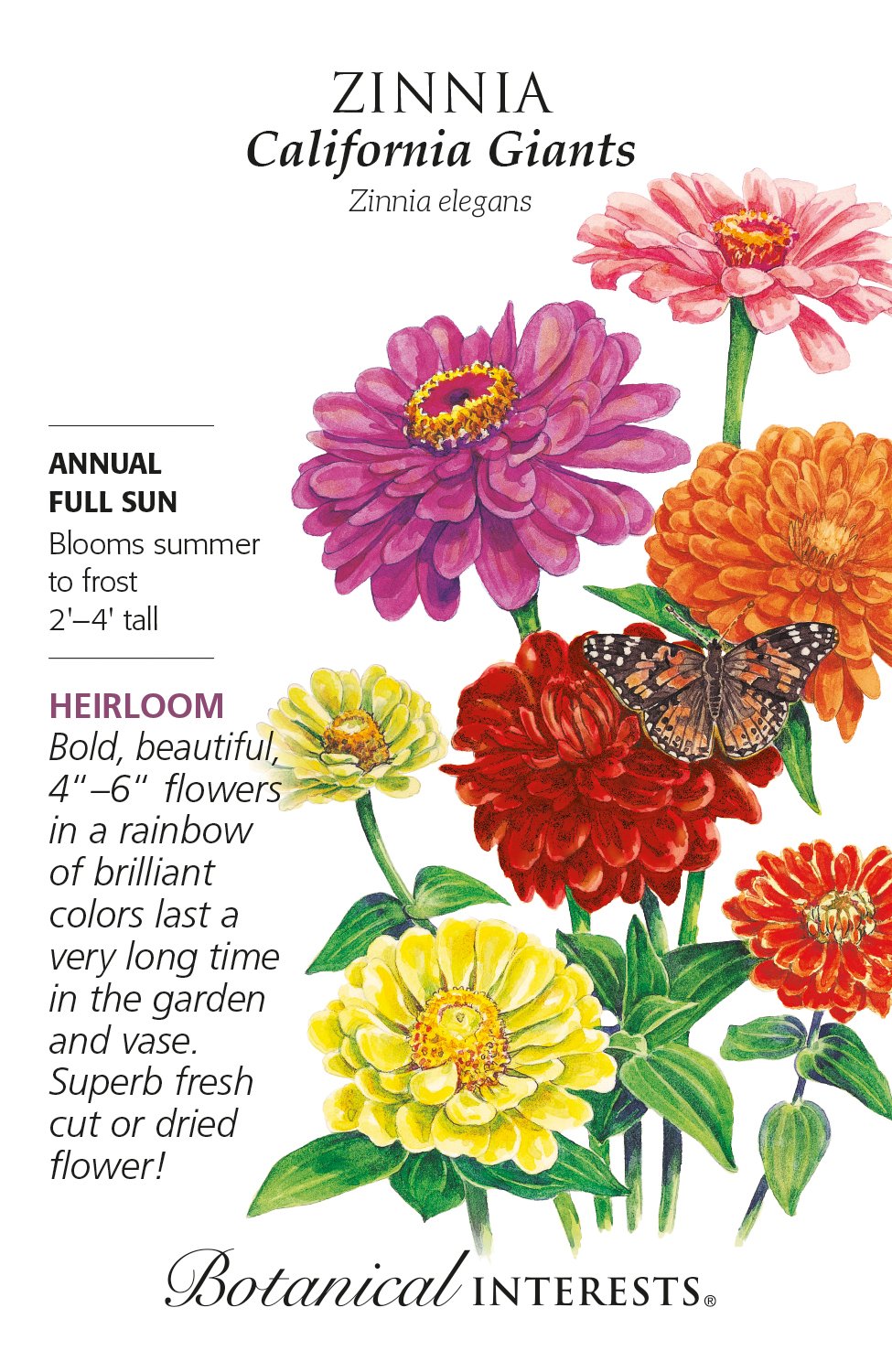 Zinnias are a must for anyone wanting glorious, long-lasting colors throughout the garden as well as for cut flower arrangements. The more you cut, the more they bloom! Since 1926, 'California Giants' has delivered large blossoms on heat-loving, tall plants; stunning planted in mass. Each individual flower lasts a very long time on the plant, and in the vase.
