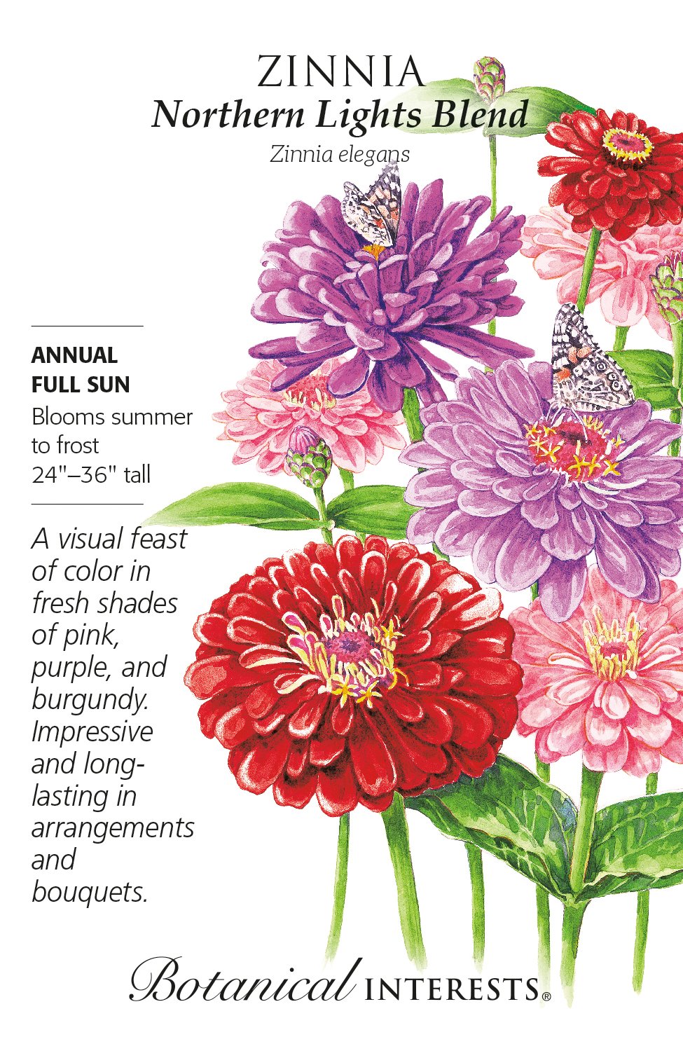 Just like Mother Nature's spectacular light show, our custom blend shines with dazzling flowers that flourish in the sunny garden. Large, 4"–5" flowers are great for attracting butterflies and bees. Easy-to-grow zinnias look best when planted in masses in a bed or border, or mix with daisies, bachelor's buttons, hollyhocks, foxgloves and snapdragons to create a lovely cottage garden. Zinnias are essential in the cutting garden and make wonderful, long-lasting, fresh bouquets.