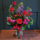 This tall and elegant arrangement is designed with romantic jewel tones.