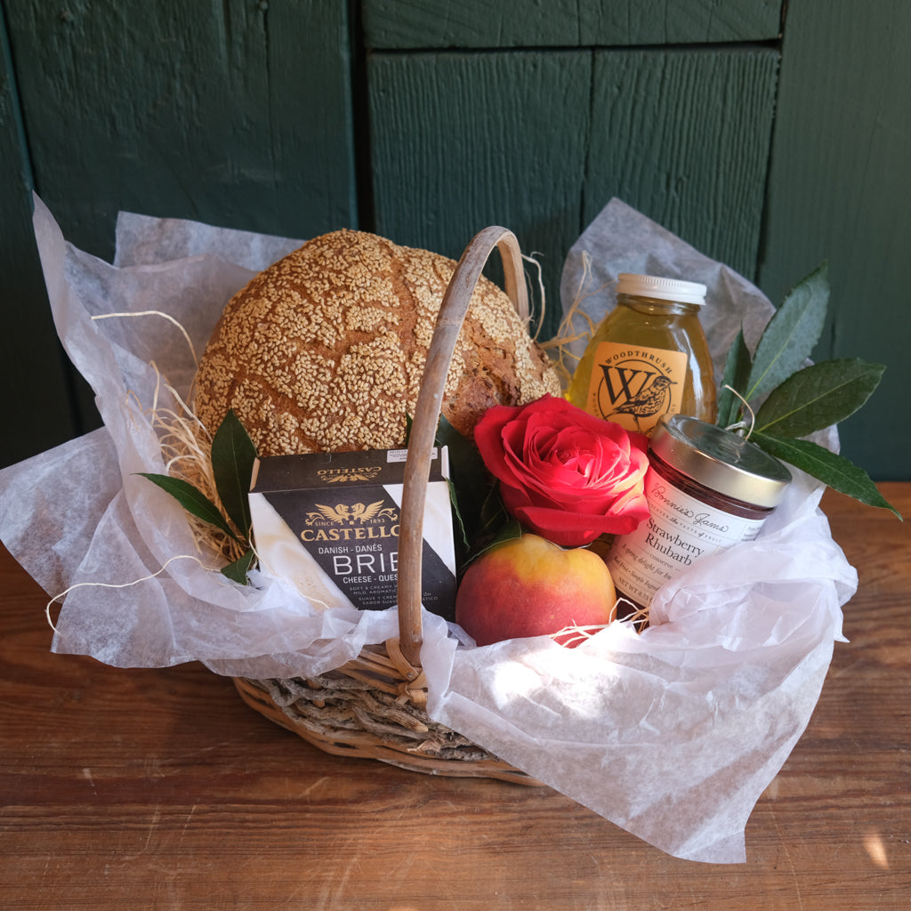 This basket features a freshly-made loaf of bread from Bread & Roses Bakery, cheese, fruit, honey, and jam.