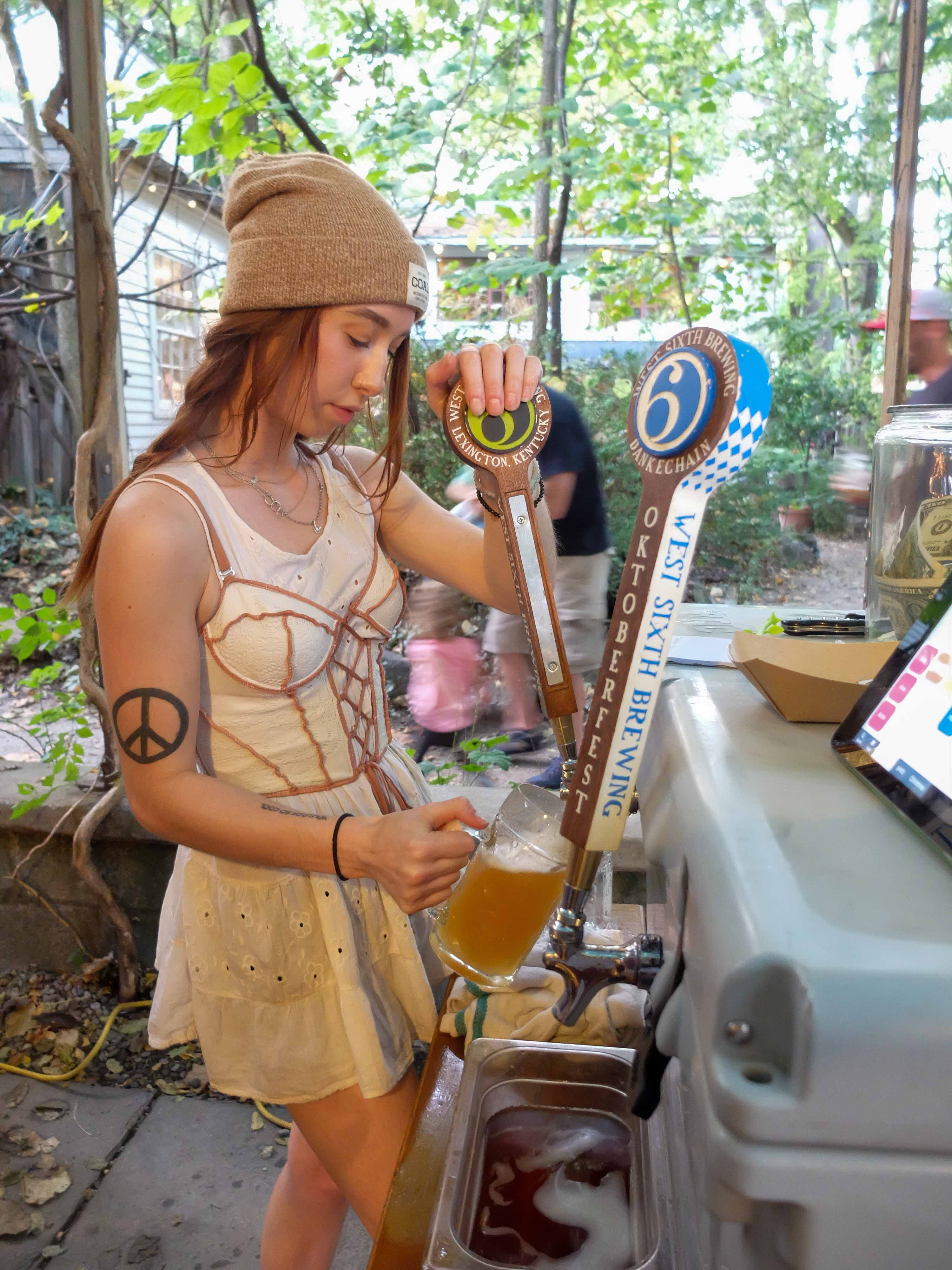 Oktoberfest under the trees with live music, giant pretzels, and extra beer taps.