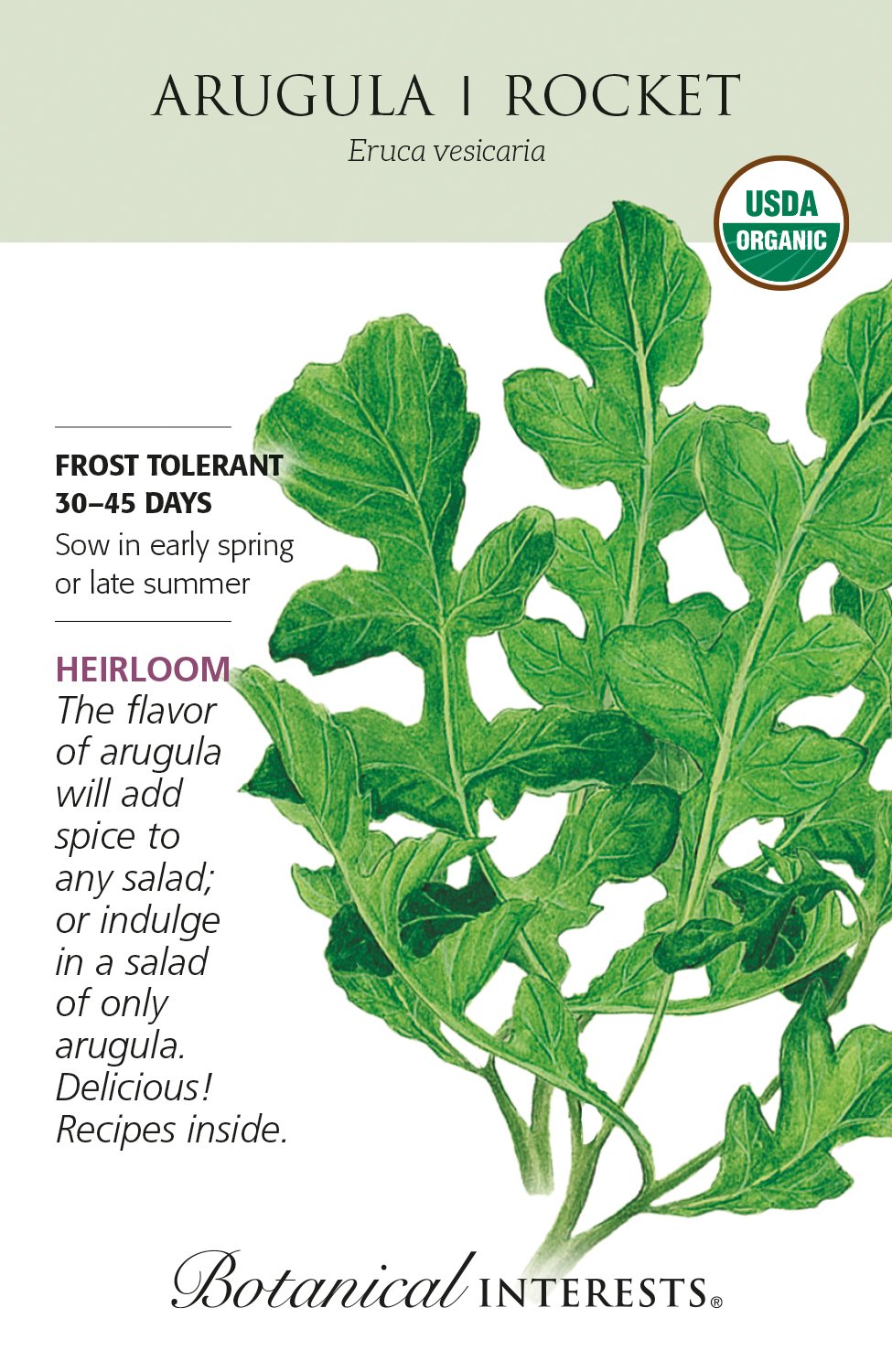 Arugula's flavor has been described as peppery, mustardy, and hot with a hint of tartness. It adds such an exciting, interesting flavor to salads. Most often eaten raw in salads but also steamed or added raw to many other dishes such as pizza. Also a good container variety.