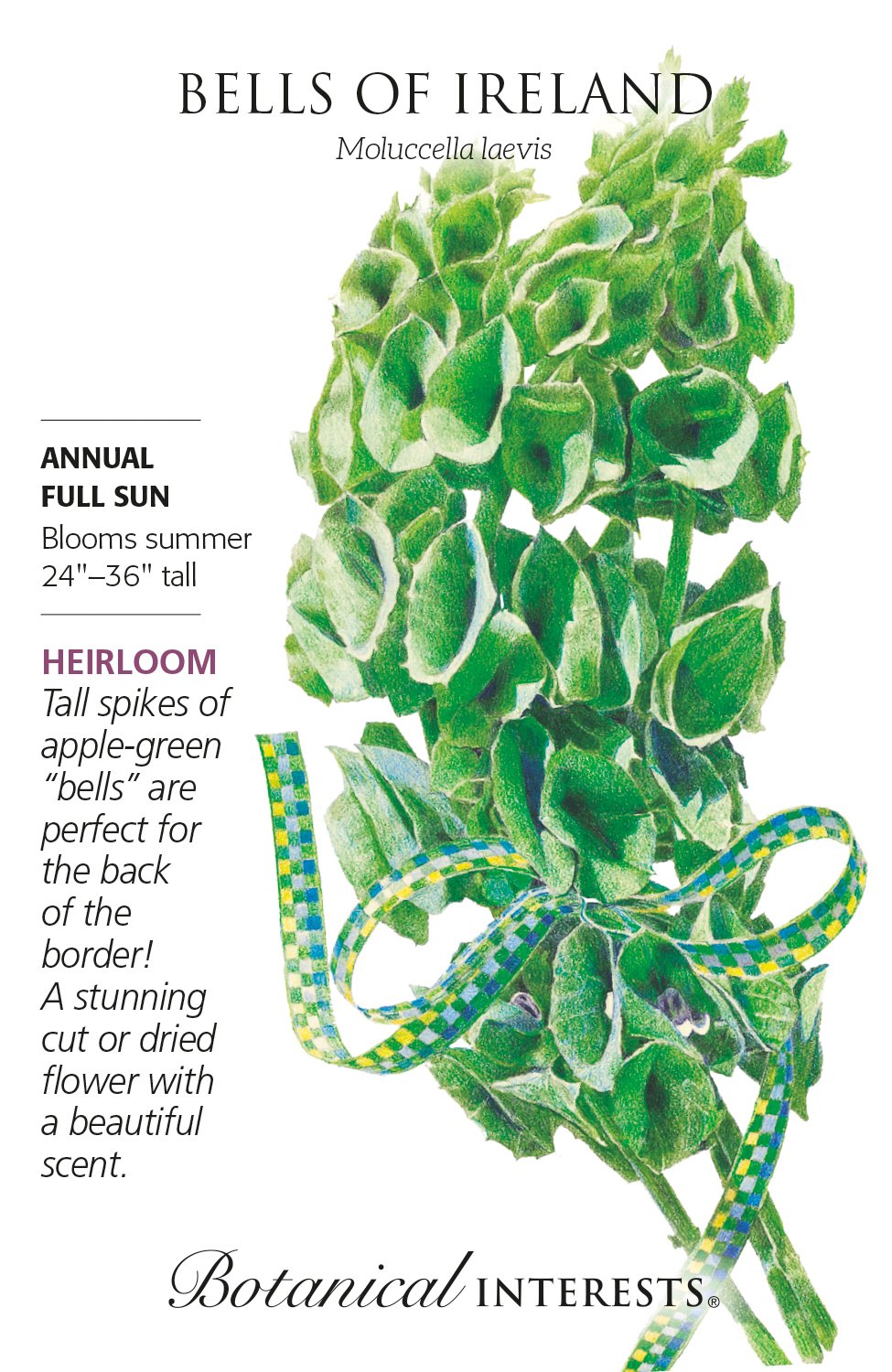 Not only Irish eyes will smile at this unusual plant. Its bright green bells with their tiny white "clappers" are always a conversation piece. Turns straw-colored when dry—a very valuable, long-lasting dried flower. The strain in this packet was selected for its superior cut and/or dried flower use. Reseeds, often producing new plants the following year from self-sown seeds.