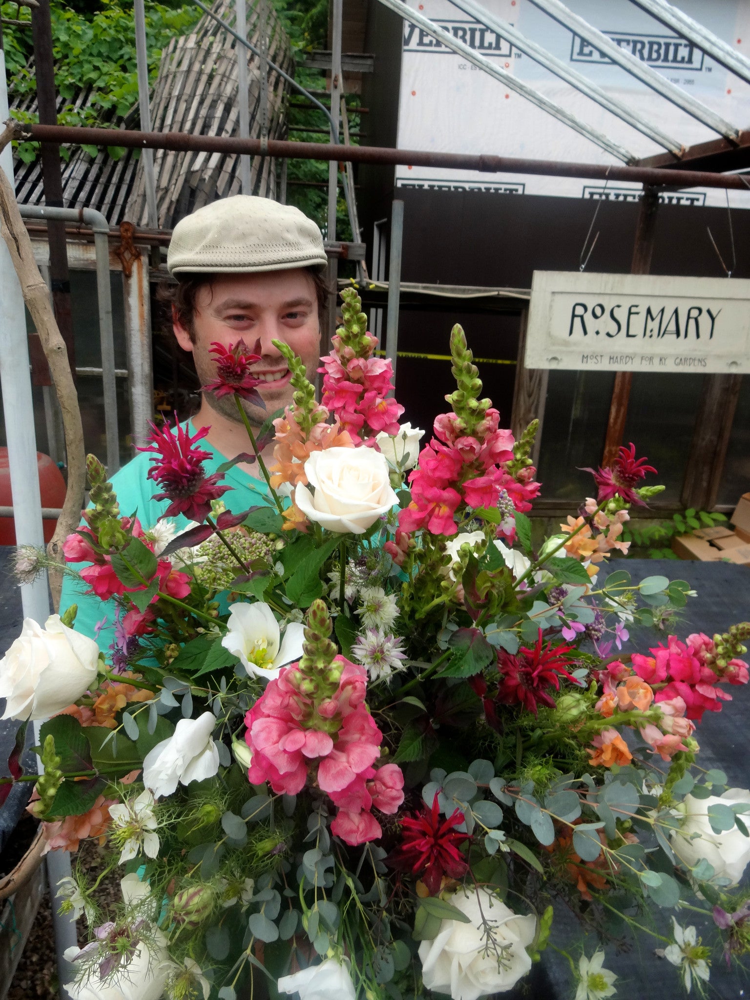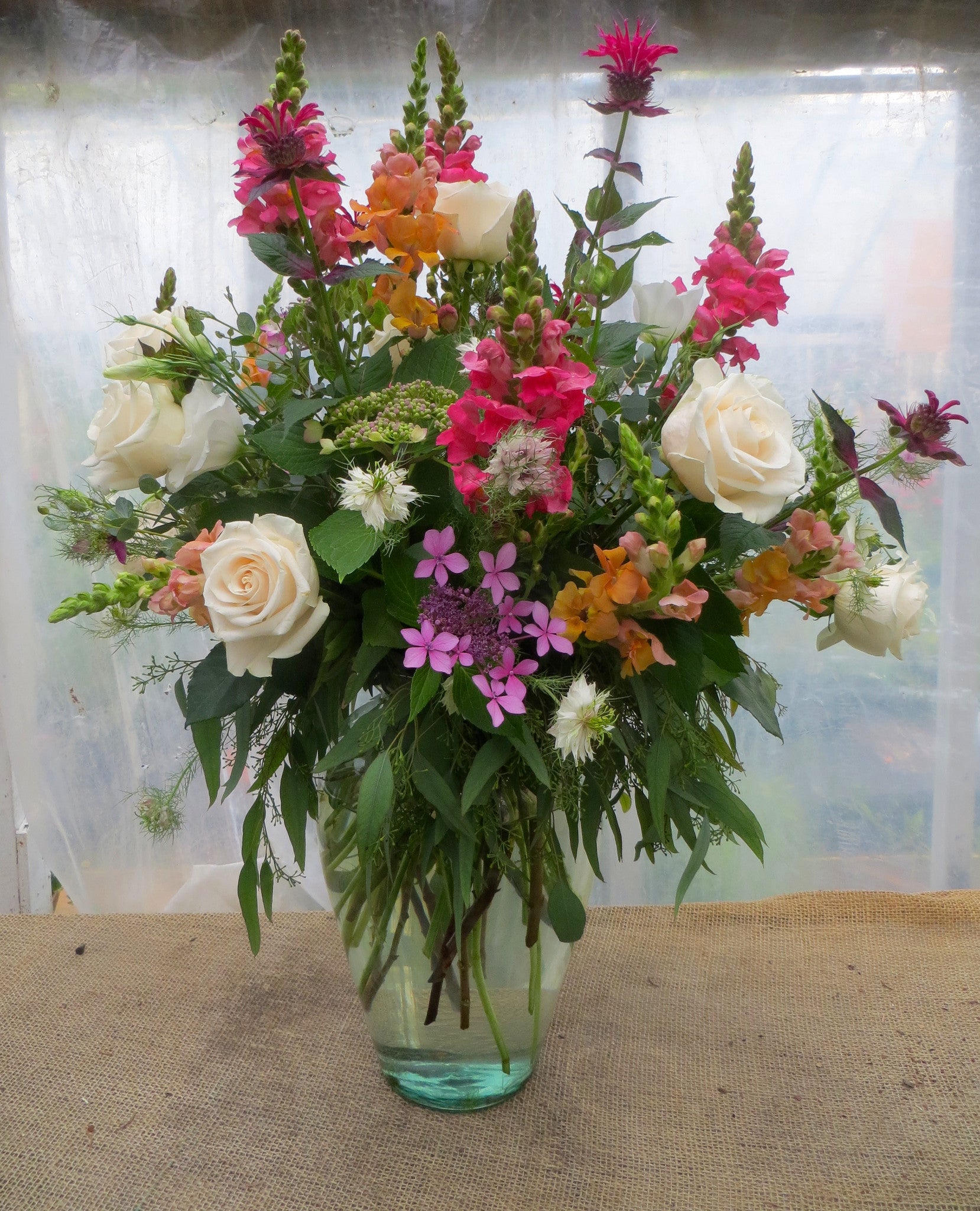 Bright floral design and full of local summer flowers. We rotate the flower varieties used as summer progresses to display our local gardens' bounty. This large flower arrangement is designed all-around for a full and vibrant display at any angle.