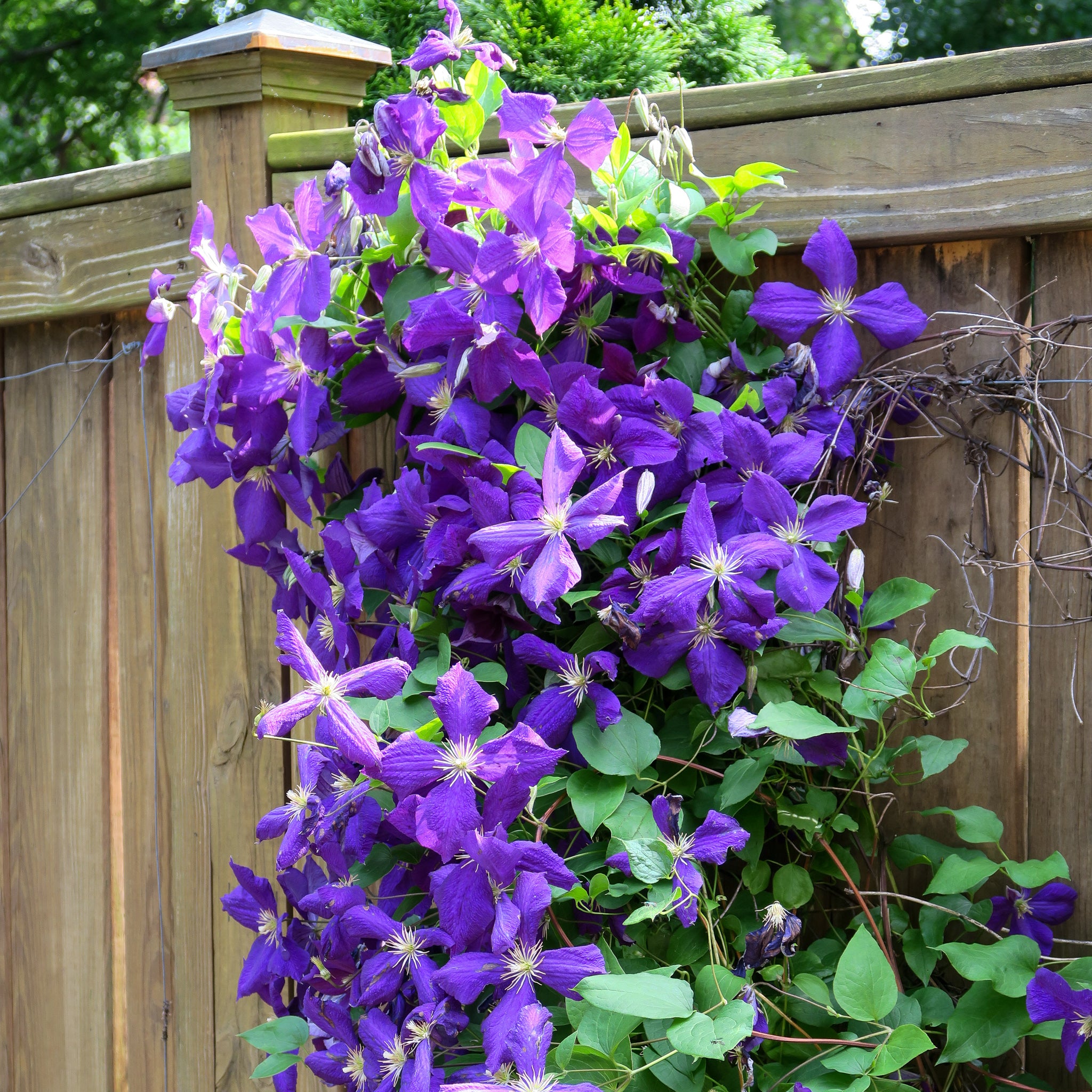 Introduced in 1862, was the first of the modern large-flowered hybrid clematises of gardens and is still one of our most popular plants today. Prefers full sun to part shade and consistently moist soil. Produces profuse blue-purple blooms approximately 5 to 7 inches in diameter. When trained over a trellis or other support, plants can reach a height of 7 to 10 feet with a spread of 3 to 6 feet.