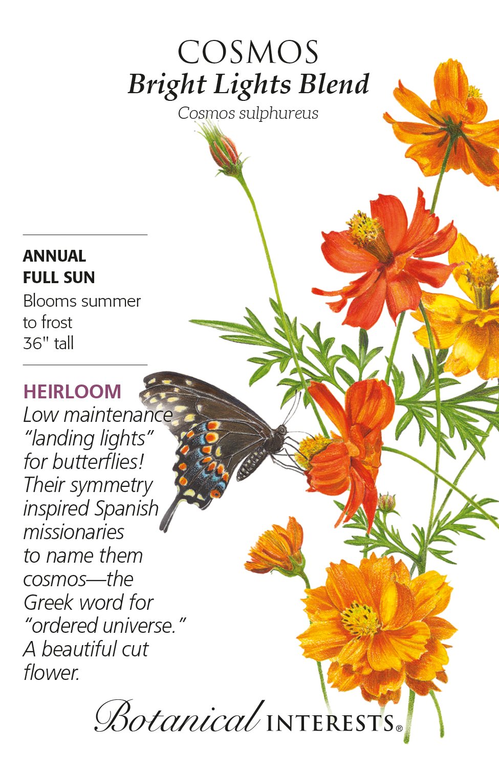 Bright Lights is a cosmic beauty show from midsummer until first frost. Vibrant, bold, 2 1/2" flowers on 36" plants attract butterflies and hummingbirds that love the nectar from the blossoms. Cosmos are a superb choice for wildflower and naturalized areas, as they are drought tolerant, and neglect is the kind of care they prefer! An excellent cut flower.
