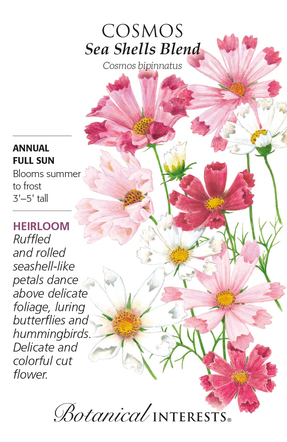 These charming cosmos with fluted, seashell-shaped petals will be a beautiful addition to your flower patch! In shades of white, pink, rose, and crimson, they make an excellent cut flower. Easy to care for; once established they are drought tolerant. They prefer neglect over attention, making them a perfect choice for wildflower or naturalized areas.