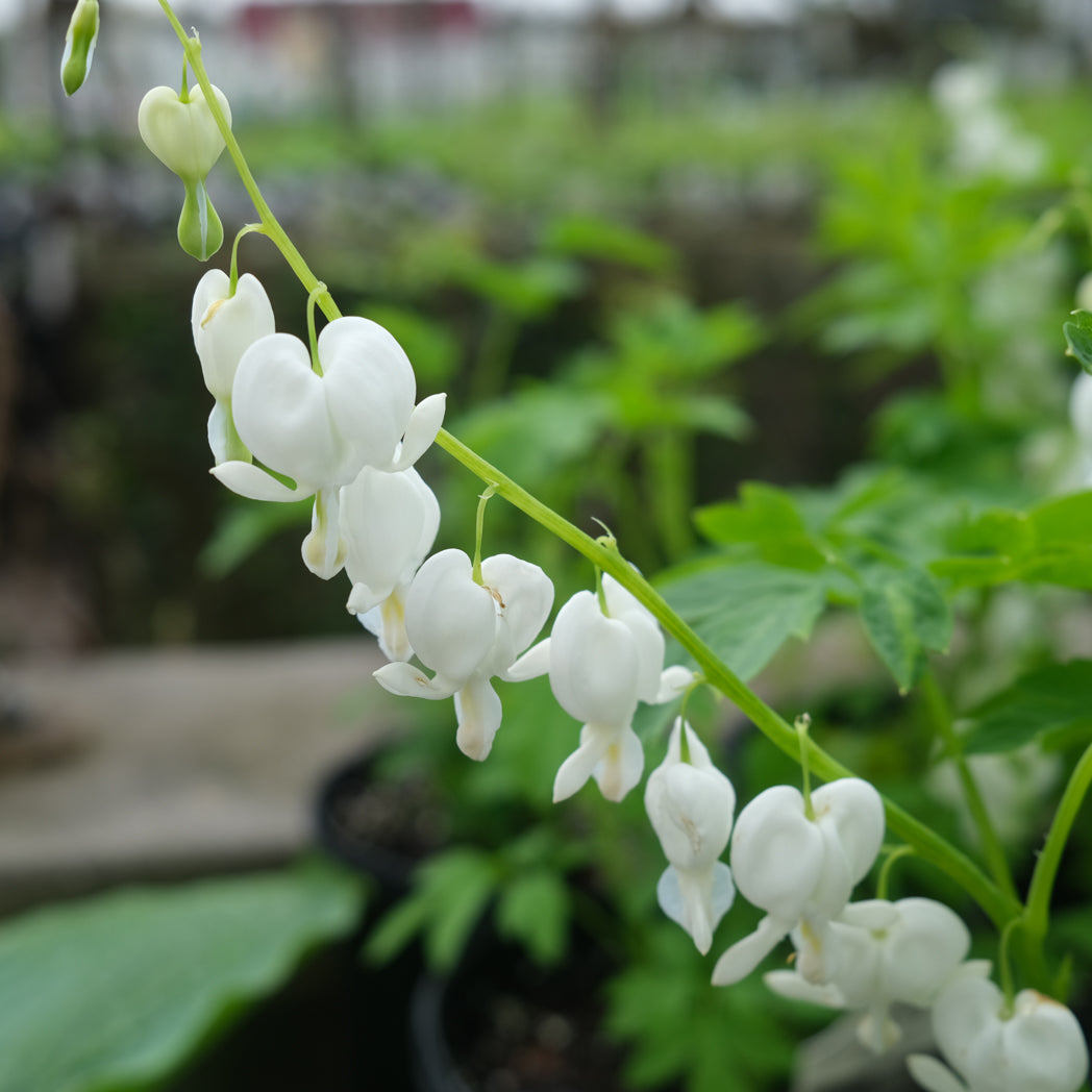 A showy, flowering perennial with heart-shaped blooms along long, arching stems. This white flowered variety blooms in late spring. Prefers part shade to full shade. Grows 2-3 tall and 1-2 feet wide.