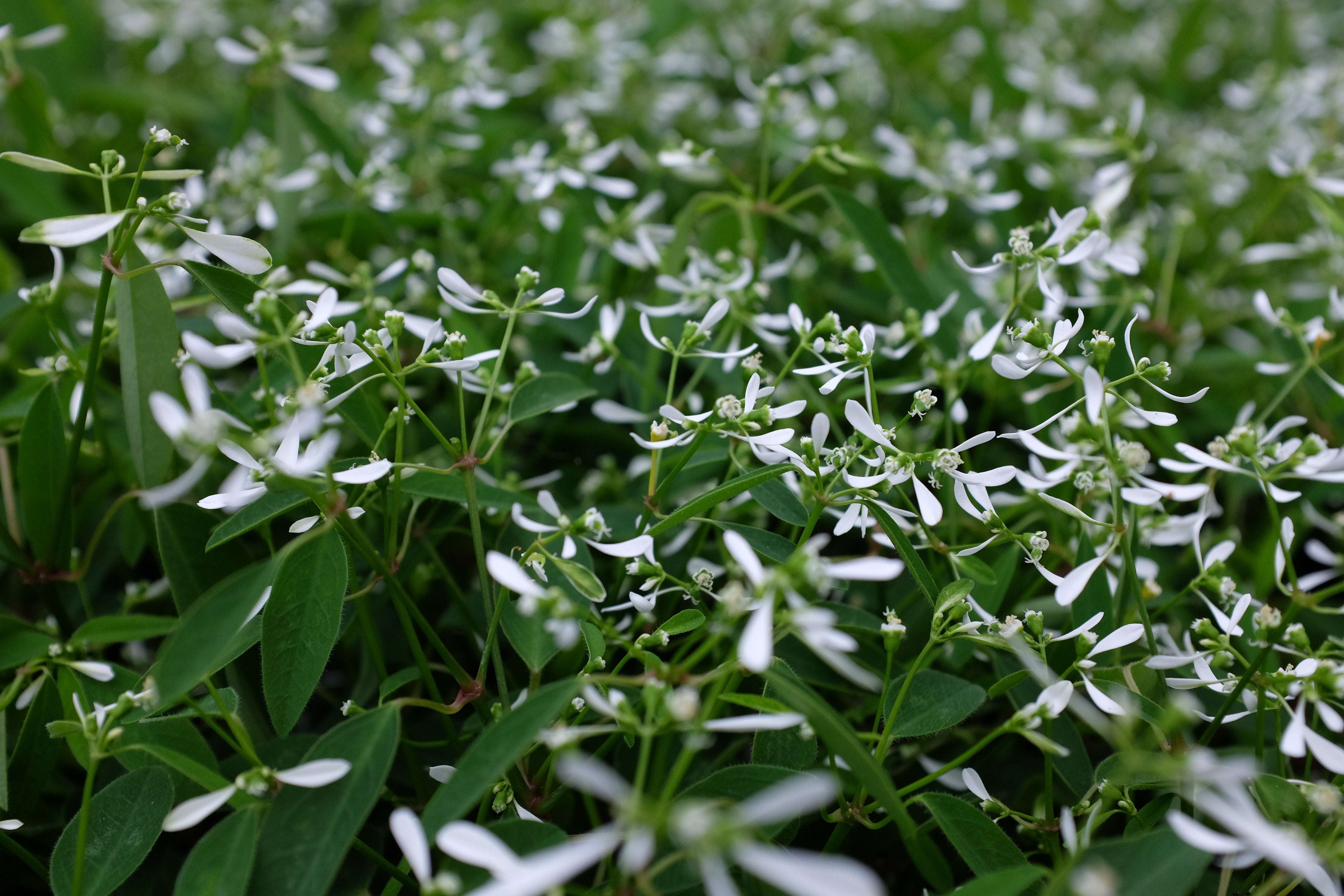 Sun to part sun. 18 in. tall, 24 in. wide. produces tons of small white flowers on a dense mass of green foliage. This Spruge is very heat and drought tolerant, its mounding habit ideal for combination plantings and hanging baskets. 'Hip Hop' spurge is known to be more floriferous than many varieties. Great filler for containers.