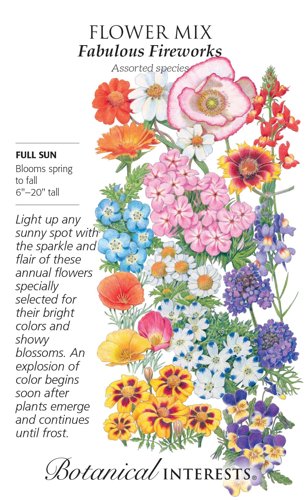 Bright blossoms sparkle in a vibrant display that lasts through the spring, summer, and fall. Sow seeds wherever you want a dash of color. Once established, plants need only minimal care. Sow in spring where bulbs such as crocus, daffodils, and tulips emerge, so that as your flower bulbs finish blooming, these flowers continue the show and fill the area with nonstop color. Many plants in this mix may reseed and come back the following year.