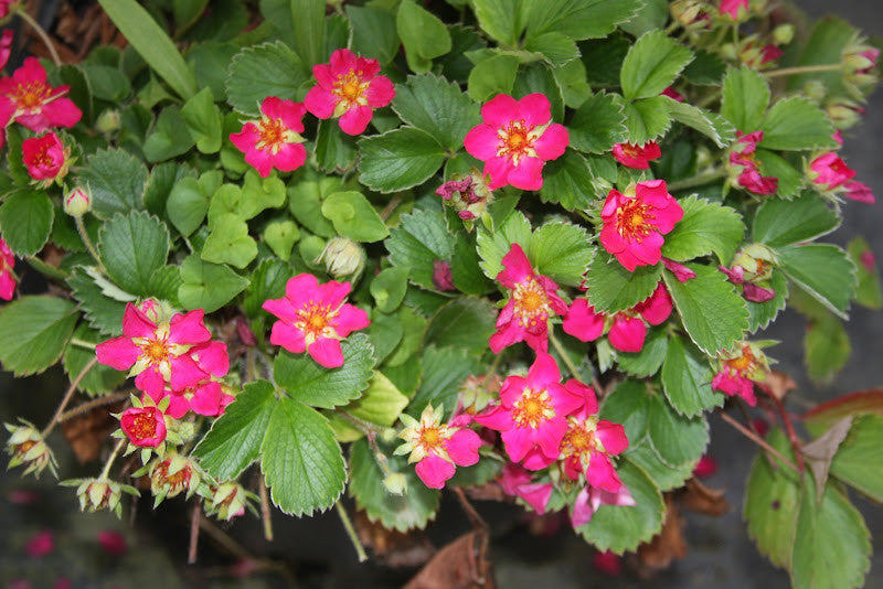 A perennial, intergeneric hybrid strawberry - a cross between Fragaria (strawberry) and Comarum (cinquefoil) - grown primarily for its ornamental value. Numerous small, five-petaled, deep red flowers with yellow centers appear from late spring to early summer and again in fall over a clump of tri-foliate, coarsely-toothed foliage that forms a bushy, compact mound. Its creeping, trailing habit makes it ideal for use as a beautiful, fast-spreading groundcover and as an accent plant for hanging baskets and window boxes. Best grown in humusy, medium moisture, well-drained soil with full sun to partial shade. Prompt removal of fruit encourages additional flowering. Deer tolerant. .5-1'H x .5-1'W. USDA Zones 3-9.