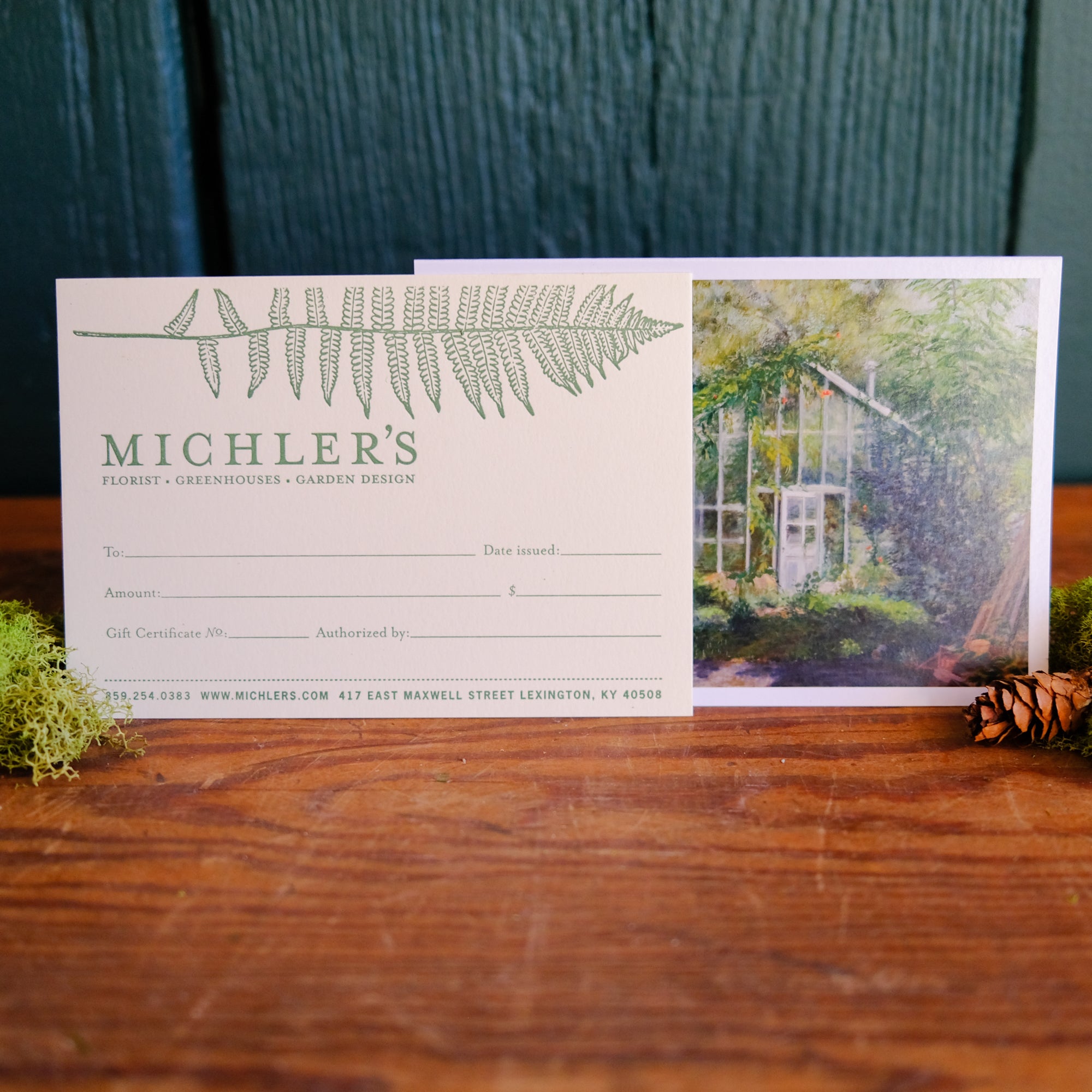 Available in any amount over the phone, or choose an amount for online ordering. A gift certificate ordered with flowers or plants is hand-delivered by Michler's, otherwise we send it via post.