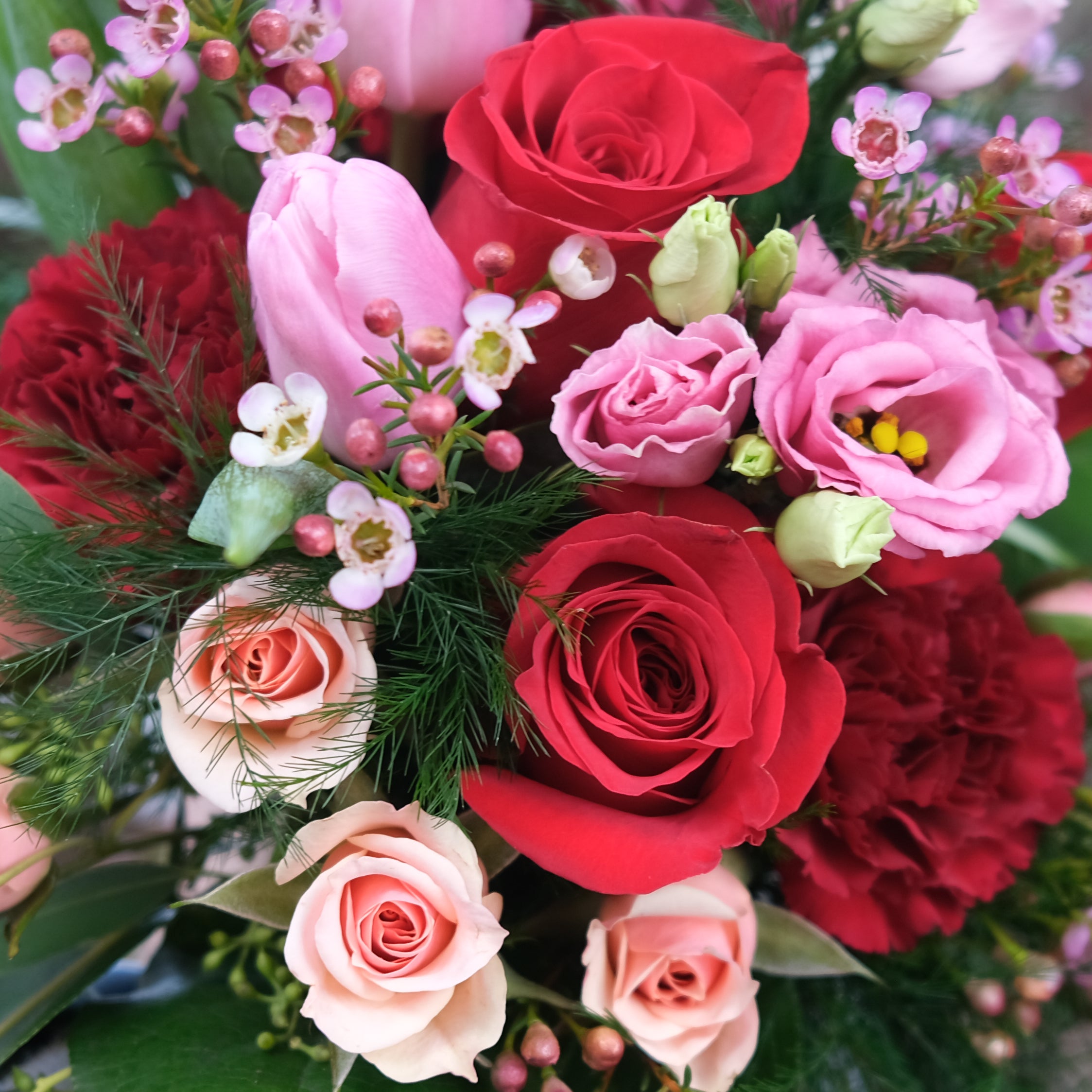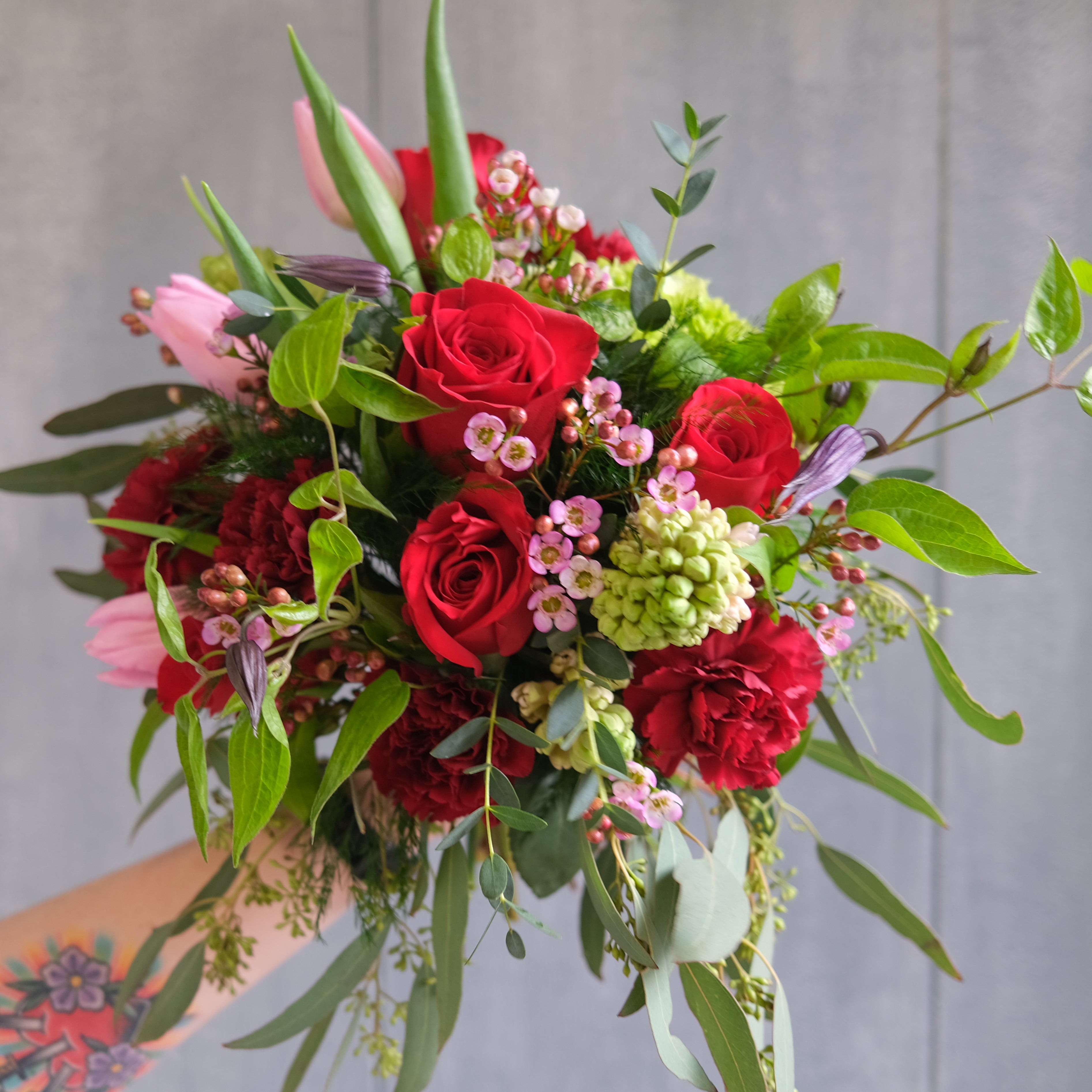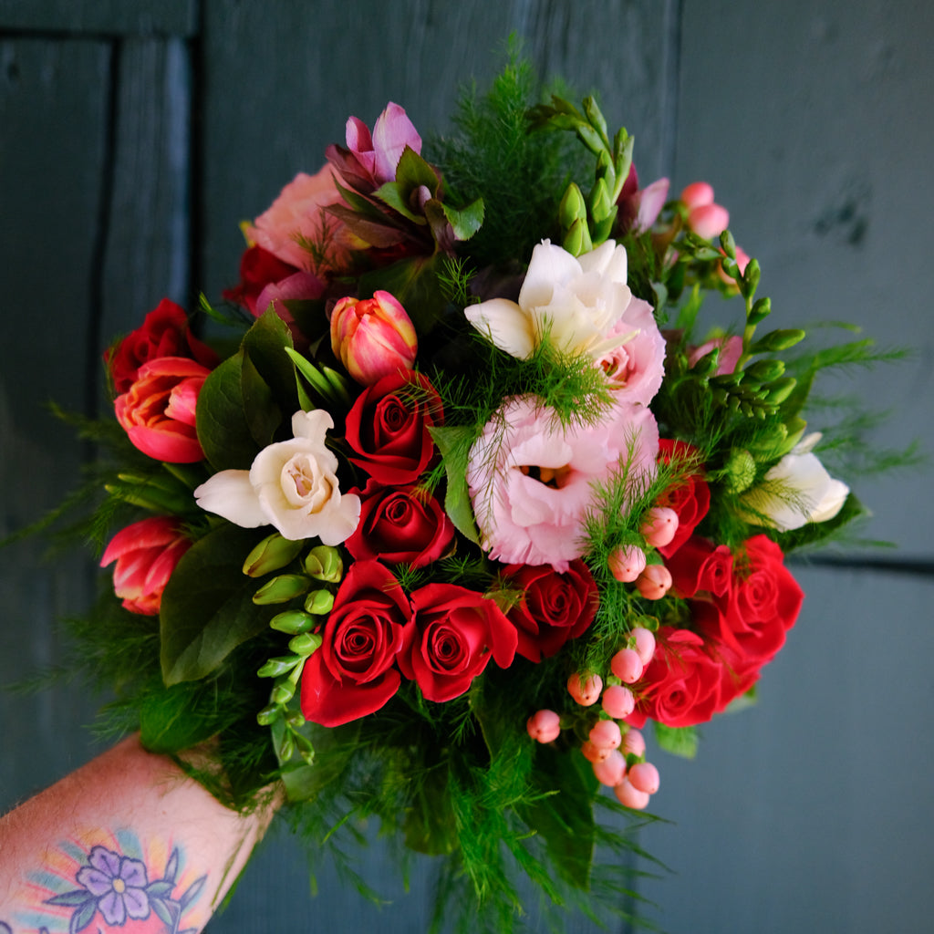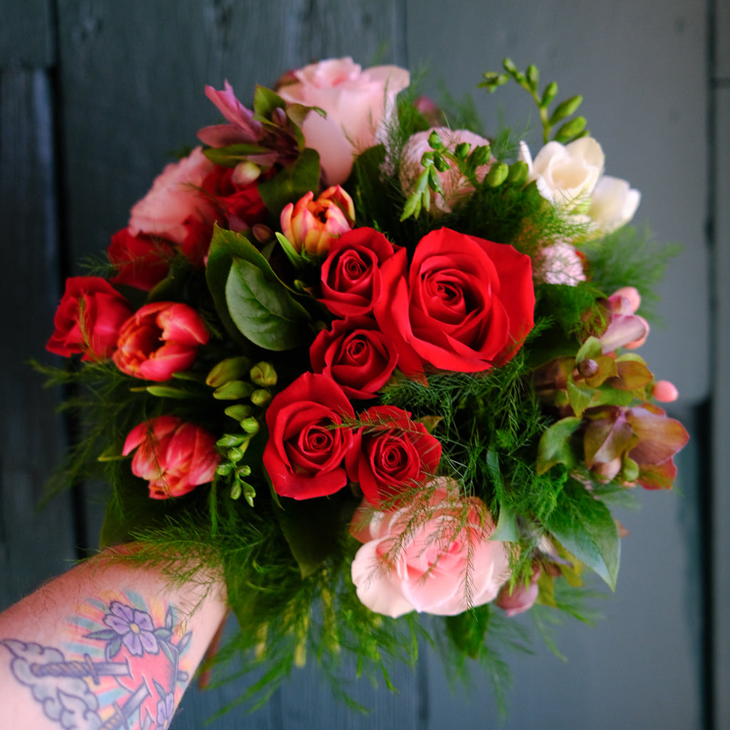 A hand-tied bouquet of flowers featuring a variety of blooms in a romantic color palette. A clear, glass vase is provided. These photos provide examples of the color palette and blooms that may be used.