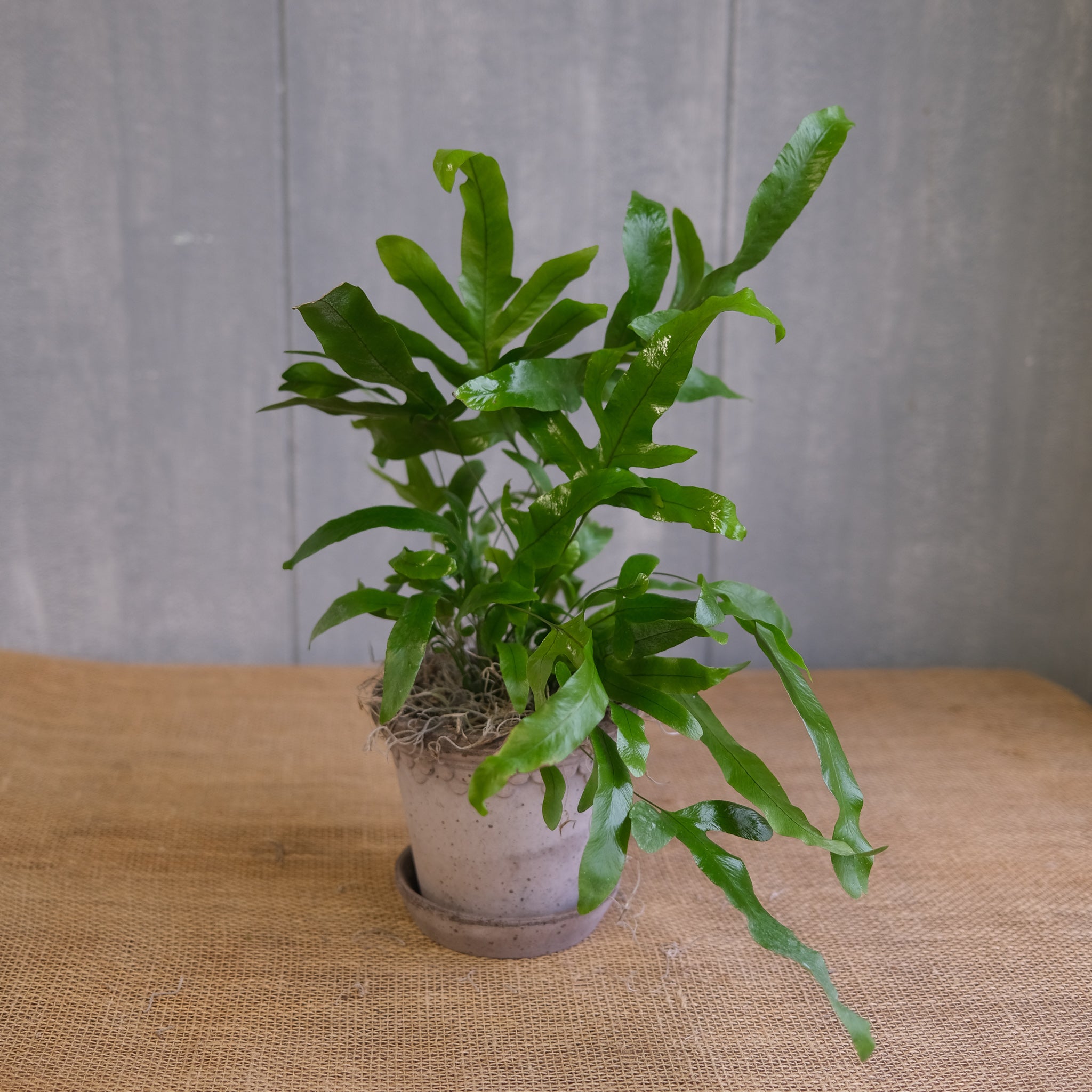 A lush fern variety with interesting leathery fronds and furry spreading rhizomes. Prefers medium to low light and moist conditions.