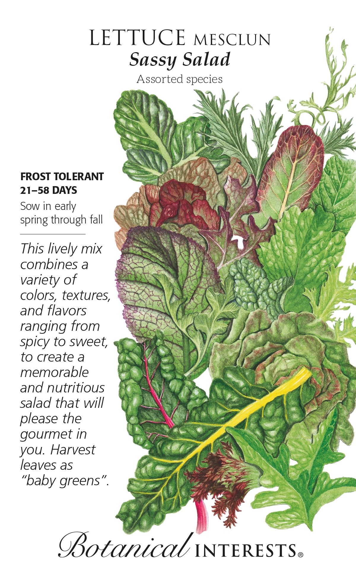 Fill your salad bowl with this bistro blend of arugula, endive, leaf, and romaine lettuces, spinach, mustard, and Swiss chard. Bursting with sweet, spicy, bold, and mild flavor sensations, Sassy Salad mix makes an exceptional fresh salad with simple vinaigrette. Cut leaves as needed. Plants will continue to grow and produce tender, new leaves. Sow successively every 3 weeks to extend the harvest. Varieties in this mix are also excellent when harvested at full size.