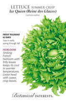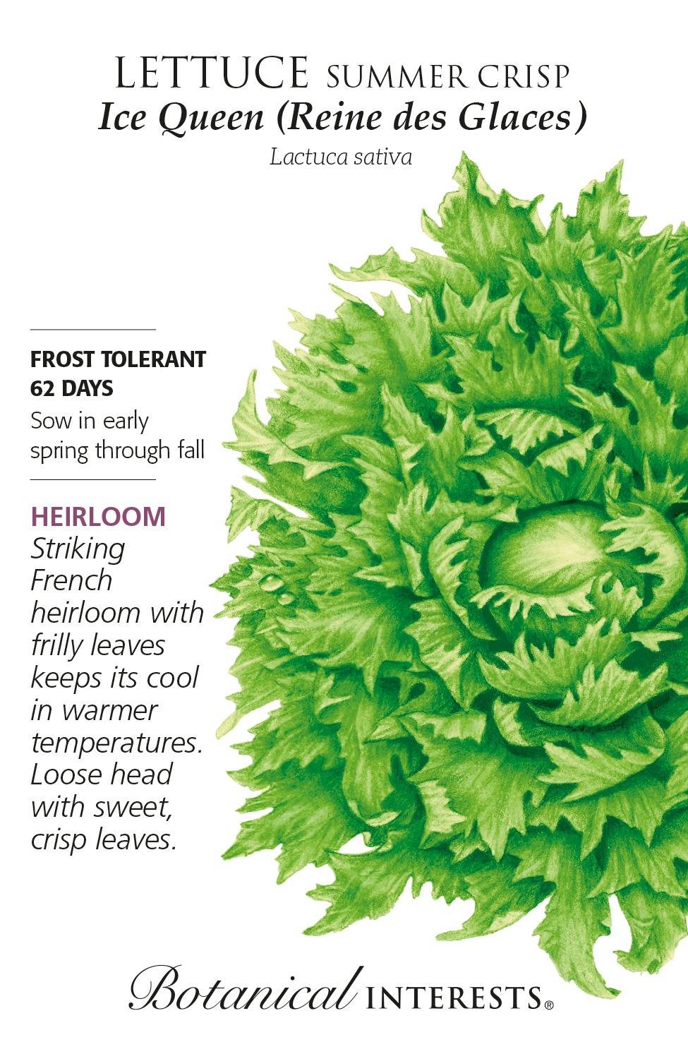 'Ice Queen' dates back to 1883, and gets its name because it is cold tolerant, but also tolerates heat well and is slow to bolt. This bright, emerald green lettuce with frilly leaves has crisp texture and excellent fresh flavor. Also delicious as a baby green. Once leaves have been cut, plants continue to grow.