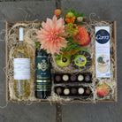 A large gift box consisting of red and white wines, two boxes of chocolate truffles, fruit, cheese, crackers, and a petite, seasonal flower arrangement. An excellent gift to send to someone celebrating a major achievement.