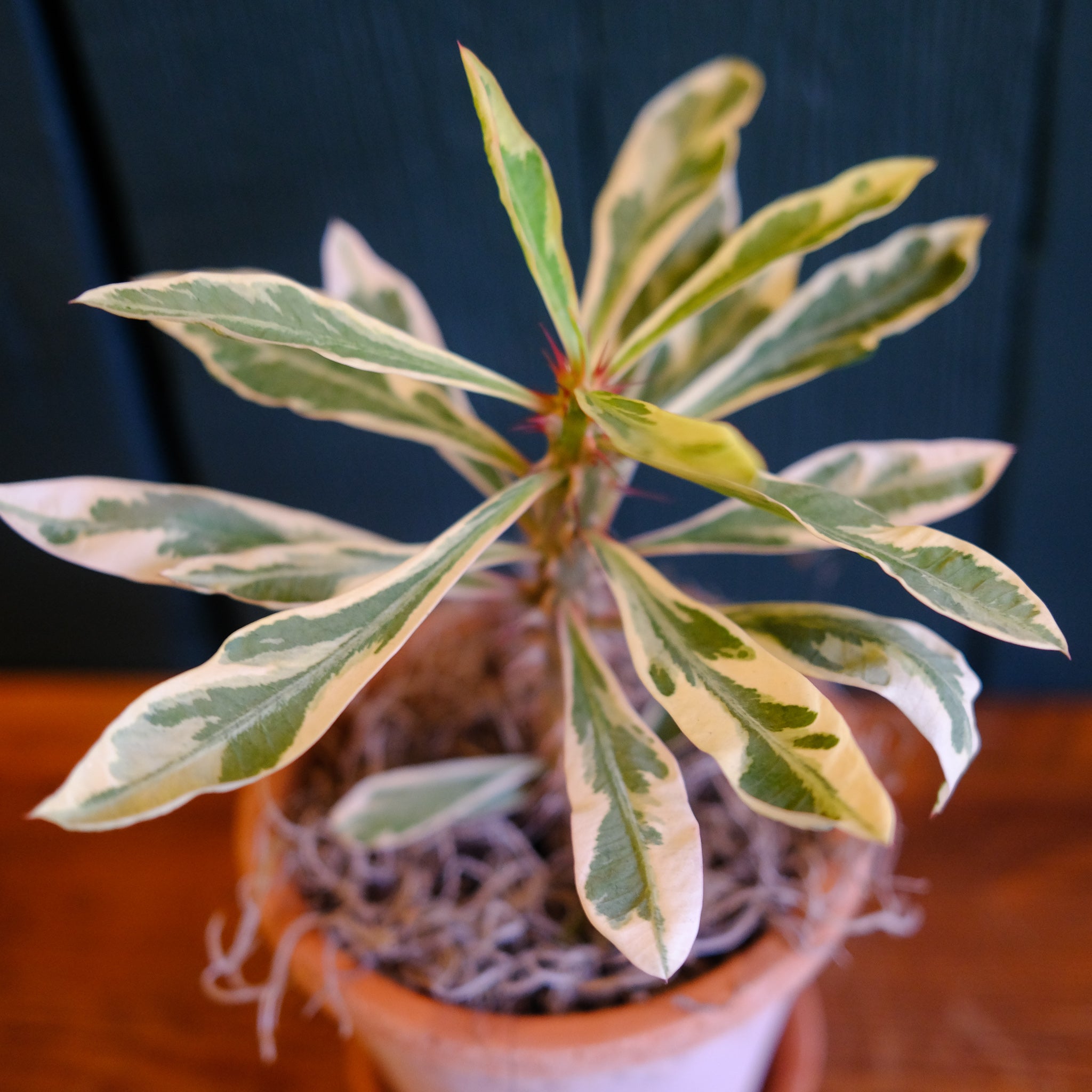 This fun variety of Madagascar palm has variegated leaves and pink blooms. It is a small tabletop size sure to add cheer to any small space.