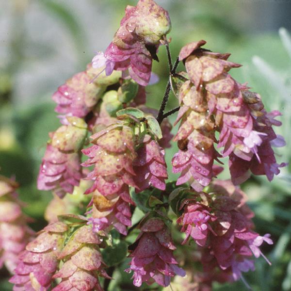 Bushy, trailing variety of ornamental oregano that produces striking bract-like flowers in the summer and early fall. Foliage can grow to a height of 10"; does well in a window box or planter where the blooms can spill over the edge. Prefers full sun and well-drained soil. Ornamental oregano is not reliably hardy through the winter--to increase the odds of it overwintering, plant in a sheltered location.