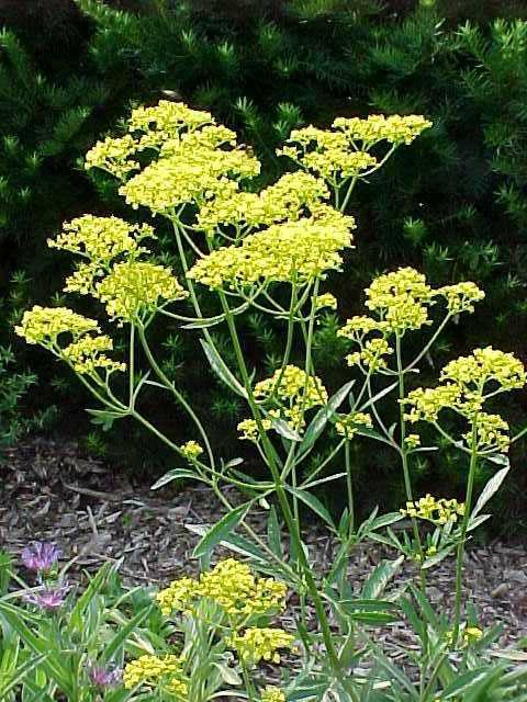Clump-forming perennial with bright yellow flowers that emerge from a base mound of deeply toothed foliage. Foliage mound grows to a height of 1'-1.5' and a spread of 1.5'-2'; airy flower stems can reach a height of 4'-6' after they emerge in the summer. Prefers full sun and rich, well-drained soil. Pollinator friendly.