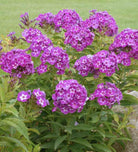 Tall variety of phlox that produces vibrant purple flowers with white eyes from mid summer through early fall. Plants grow in clumps reaching 3'-4' tall with a spread of 2'-3' and prefer full sun exposure in moist, well-drained soil. Pollinator friendly.
