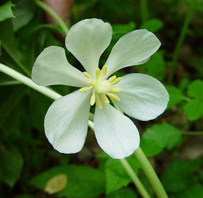 Woodland wildflower that produces a showy white flower hidden beneath large, lobed leaves. Plants reach a height of 1'-1.5' and spread slowly through rhizomes but go dormant in the summer. Prefers part to full shade and tolerates a variety of soil conditions. Once the flowers are spent, plants produce edible "mayapples" that can be used in preserves and jellies.