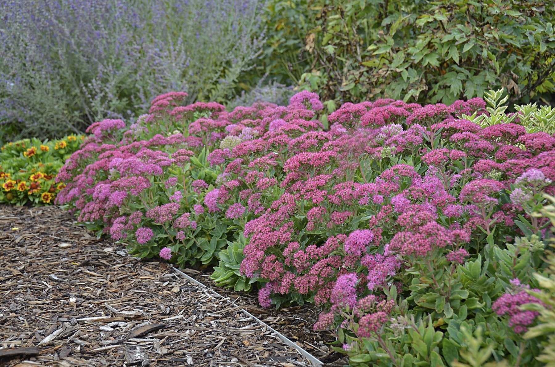 Clump-forming perennial that features large, flat clusters of tiny pink flowers in the fall. Plants grow to a height of 18" and have a similar spread. Prefers full sun exposure in well-drained soil; does well in rock gardens and gravelly soil. Pollinator friendly.