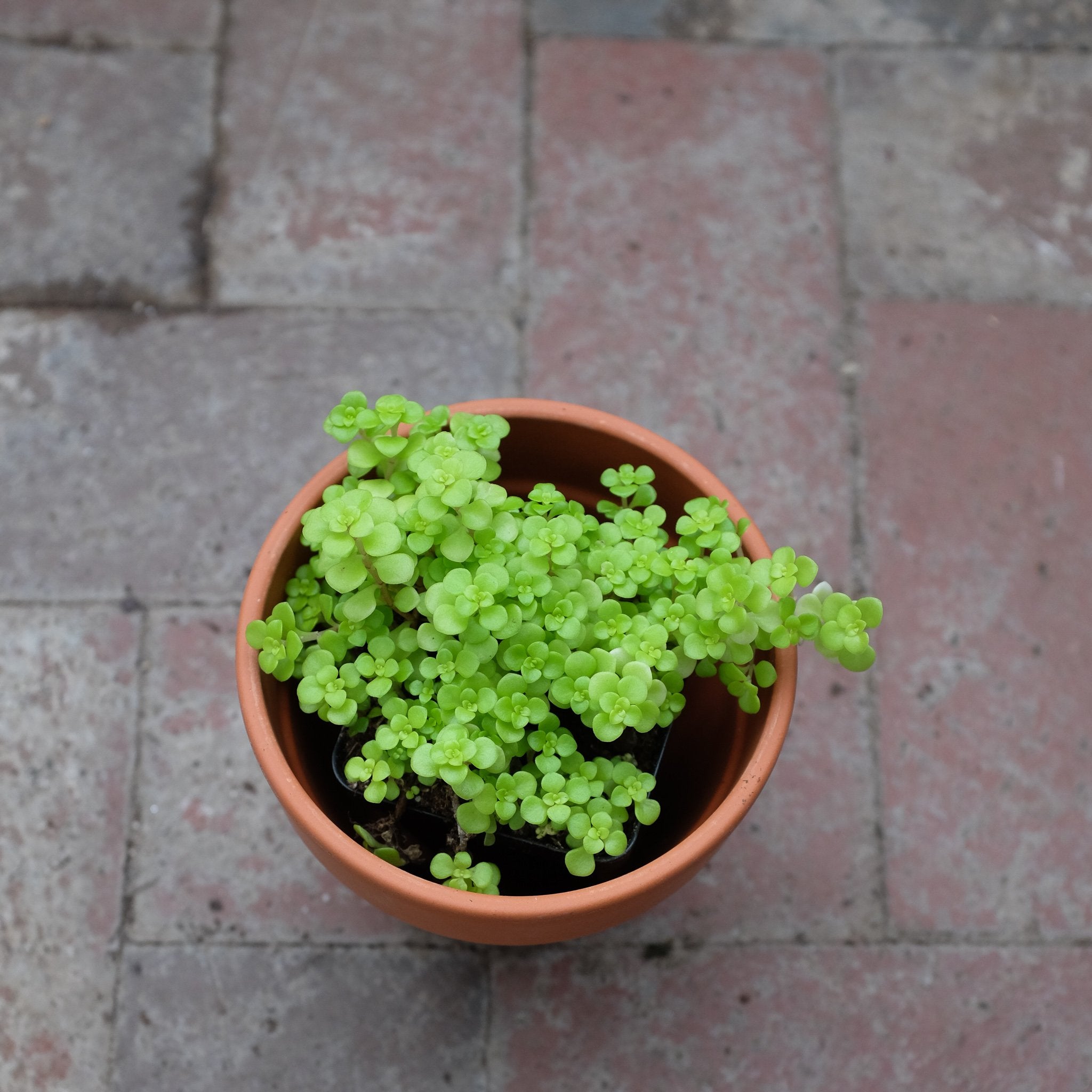 The tiny leaves of this sedum variety form dense mats wherever they're planted. Great planted solo for a pop of sunny foliage or in combination with other succulents in a planter.