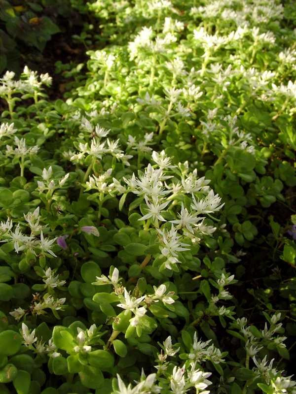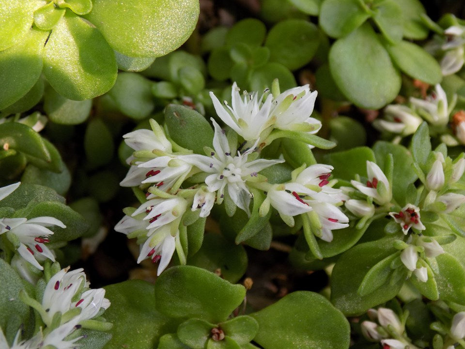 This succulent, rock-loving perennial boasts long flowering branches among shorter, leafier ones. White, pointed flowers bloom from spring to summer. Prefers part shade and moist soil. Grows less than 1 foot tall.