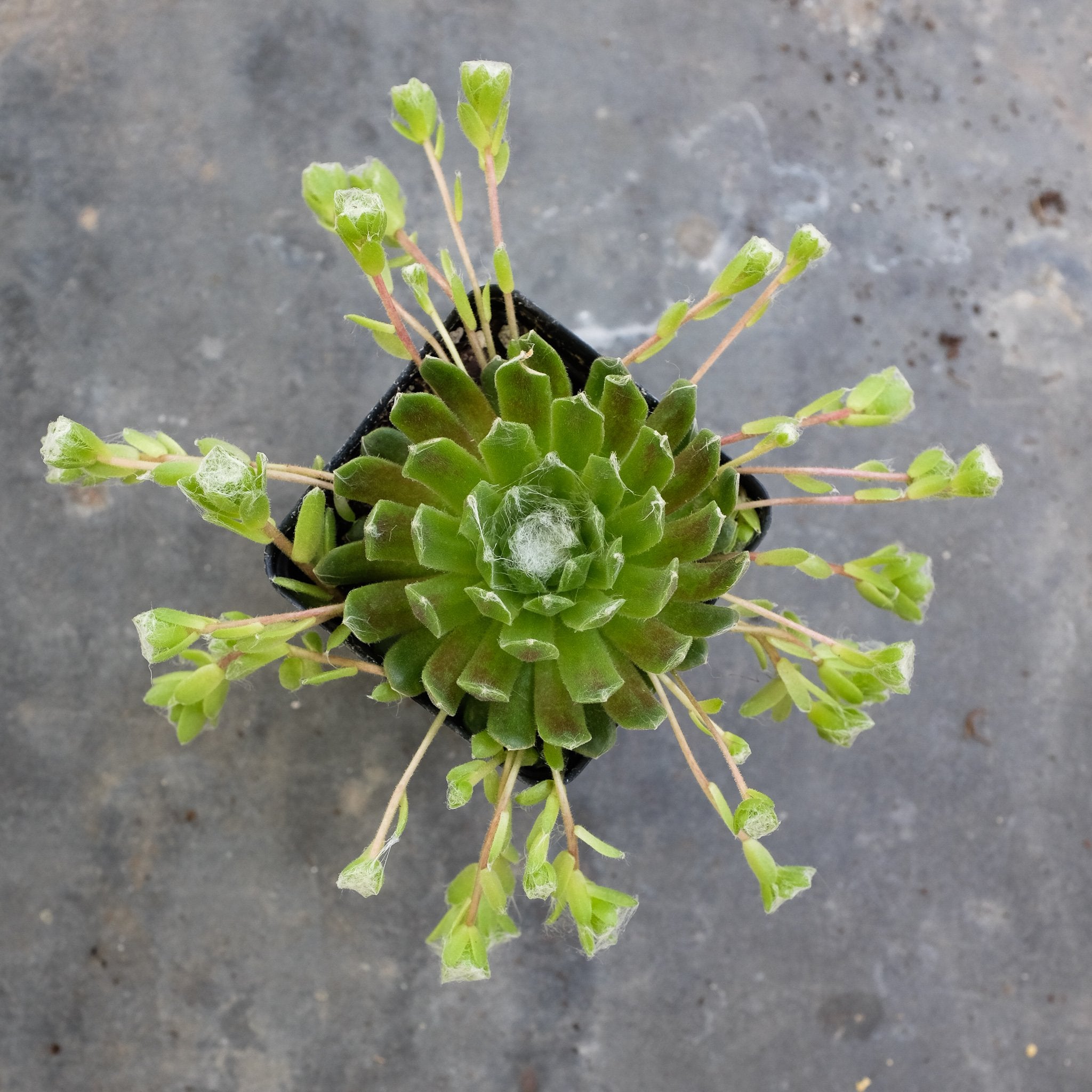 Mat-forming perennial succulent that grows in rosettes topped with distinctive spiderwebbing between the tines. Succulents grow up to 3" with a spread of up to 1' and prefer full sun exposure in well-drained soil. Parent rosettes produce offsets or "chicks" that root themselves independently. Very drought tolerant.